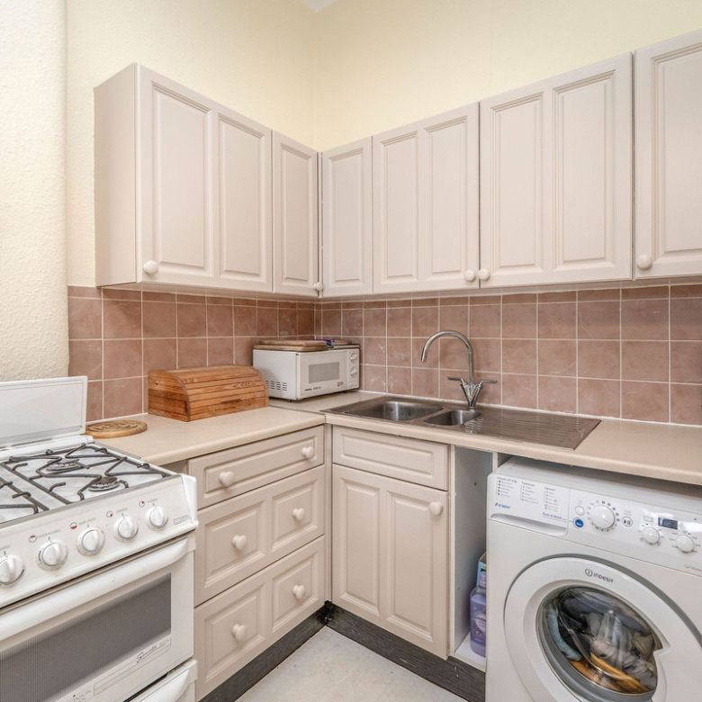 The compact yet thoughtfully designed kitchen is fitted with cream shaker-style wall and floor units, complemented by sleek worktops and a tiled splashback, with ample room for freestanding appliances. A breakfast bar is ideal for informal dining, while two built-in cupboards offer additional storage.