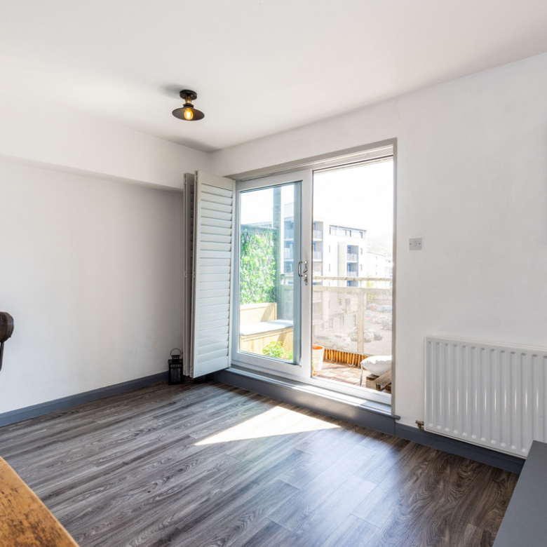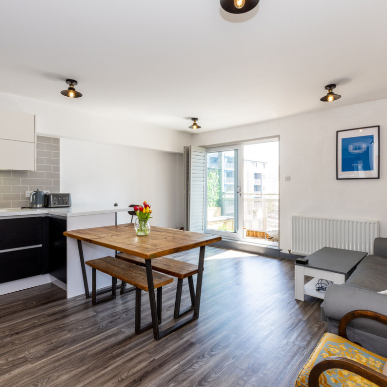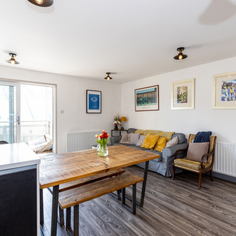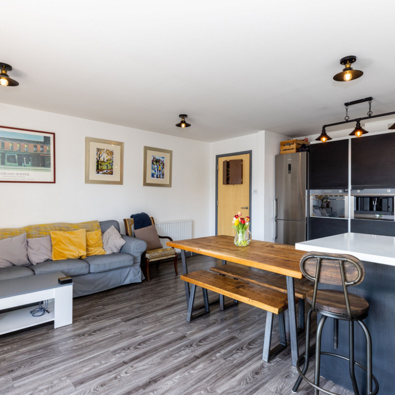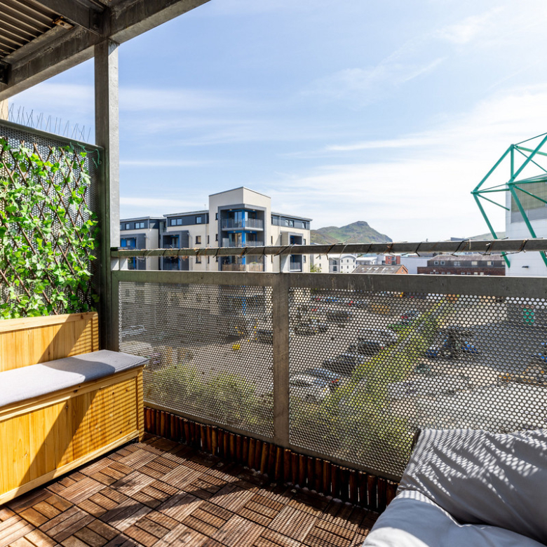 The hallway leads seamlessly into an impressive open living/kitchen/dining room meticulously designed to suit the needs of modern living and boasting a tasteful décor of wood-inspired flooring and louvred shutters. Spacious and light-filled, sliding patio doors open onto an enviable south-facing private balcony with bespoke seating and spectacular views over to Arthur’s Seat and Salisbury Crags, making this a fantastic area for entertaining and relaxing.