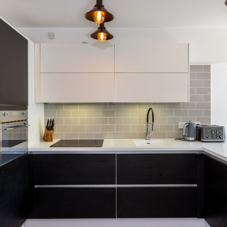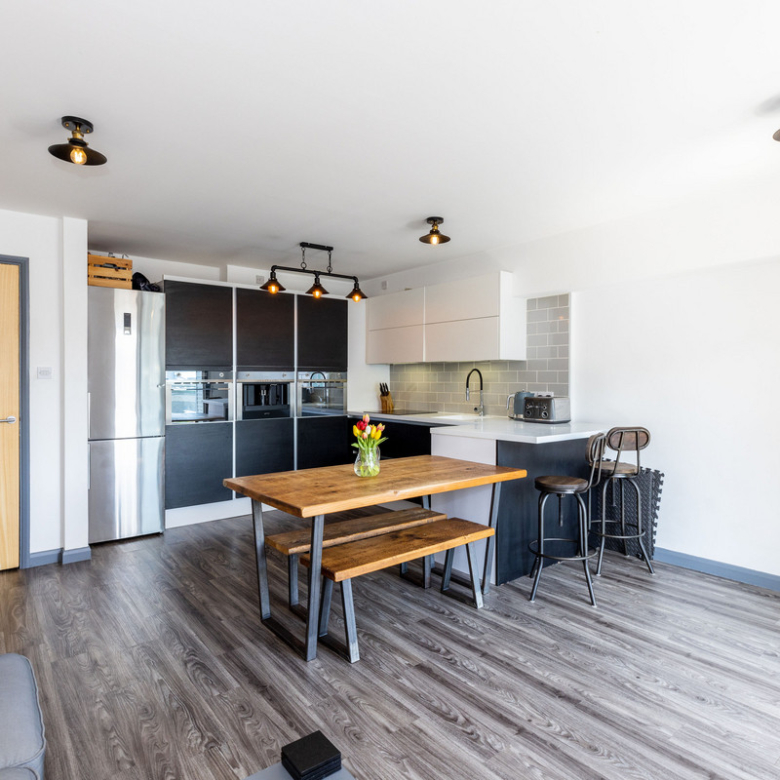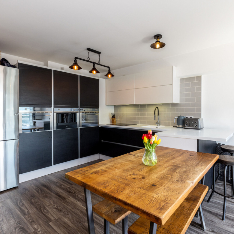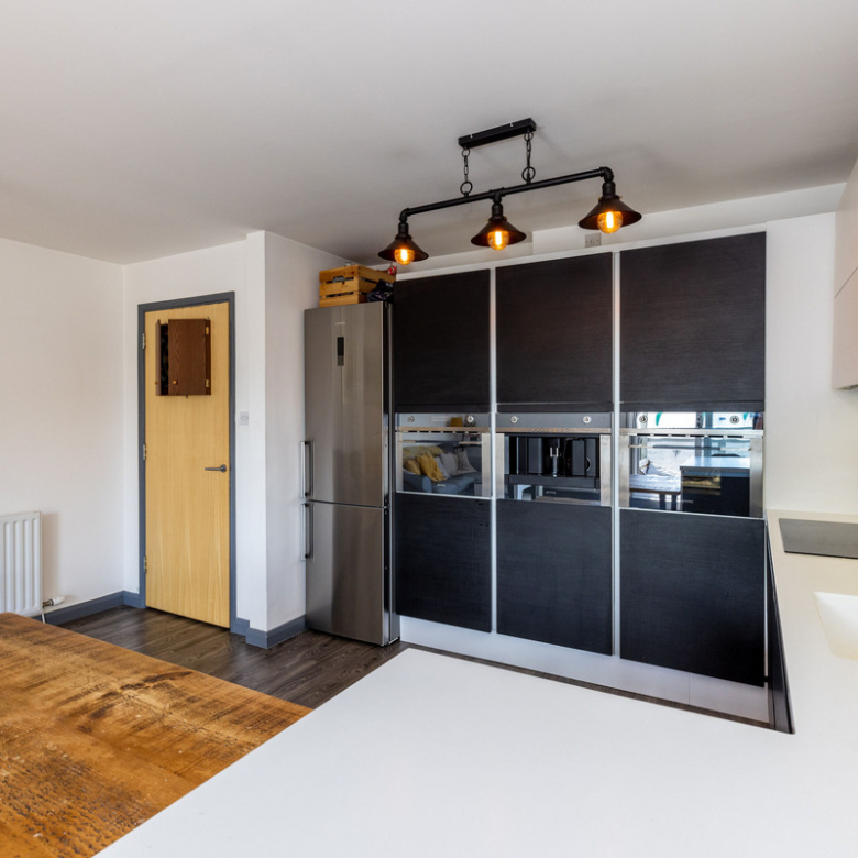 The contemporary corner kitchen boasts high-quality wall and floor units finished in gloss white and matte black to complement white worktops and a splashback of grey metro tiles. High-spec integrated appliances include a BOSCH hob, along with an eye-level oven, microwave, and a SMEG coffee machine tastefully set into a single-wall unit. Along with space for larger dining, there is a breakfast bar allowing casual dining for two.