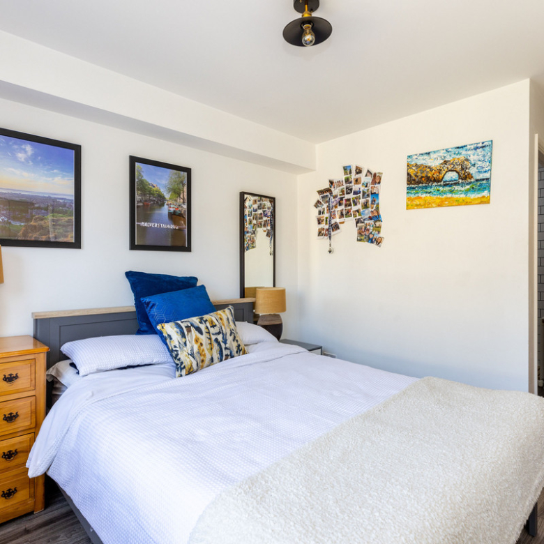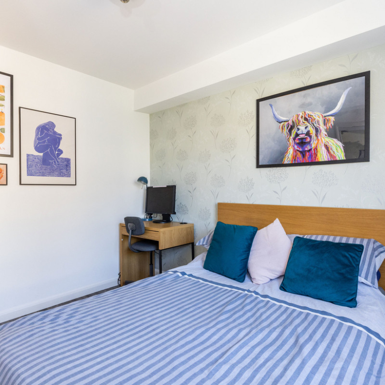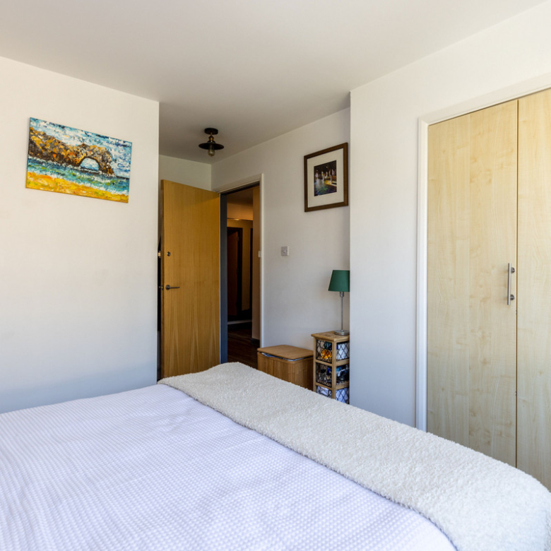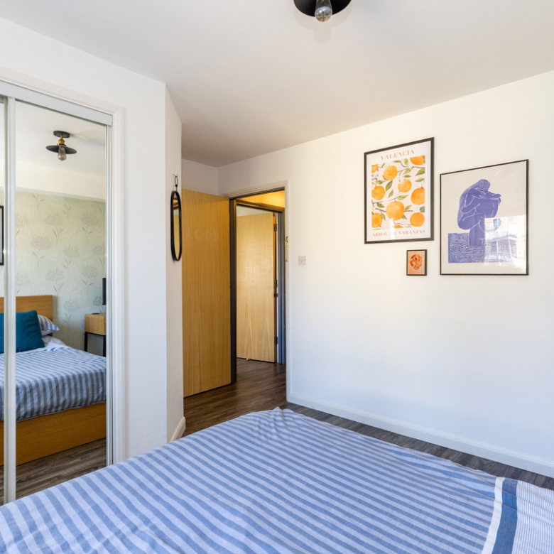 The second double bedroom adjacent to the principal has an appealing interior design and built-in mirrored wardrobes, with a comfortable layout allowing for freestanding furnishings.