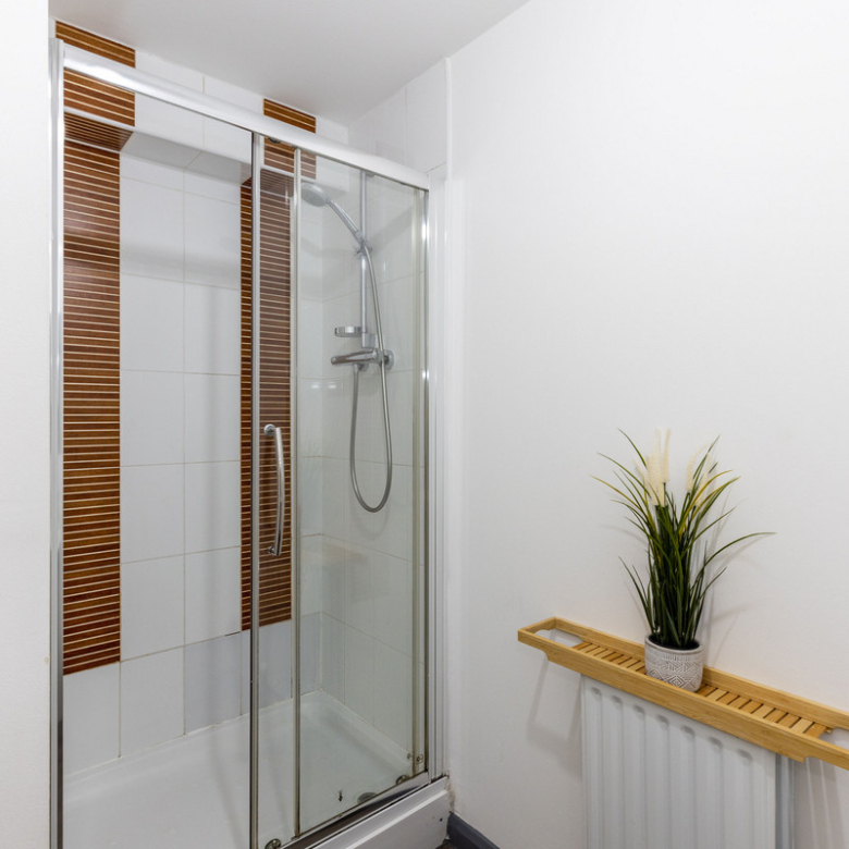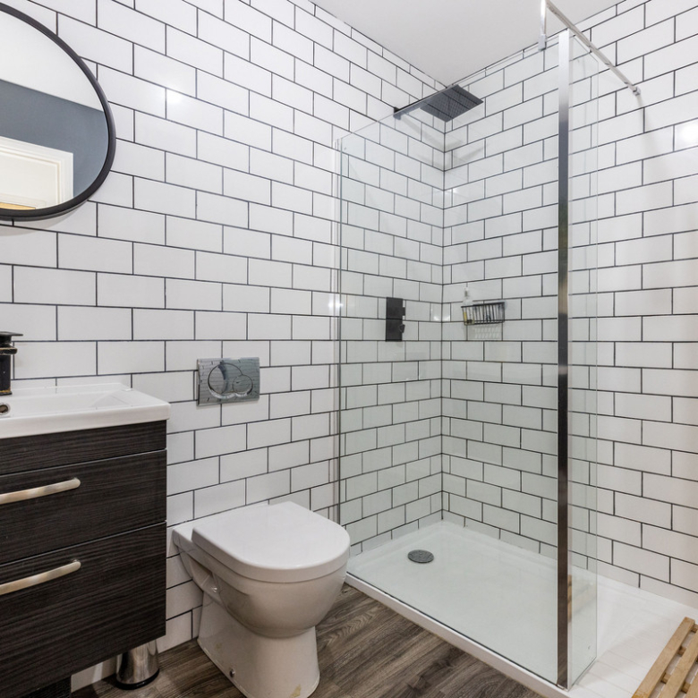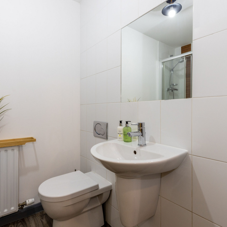 Well-appointed the partially tiled family bathroom has a walk-in shower, hidden cistern WC, and washbasin.