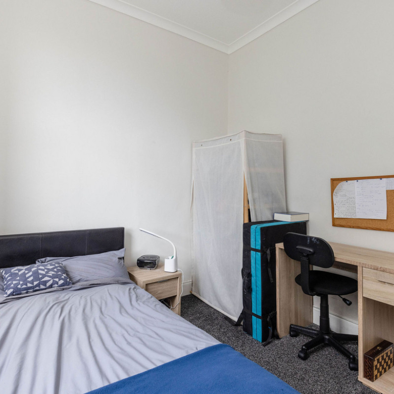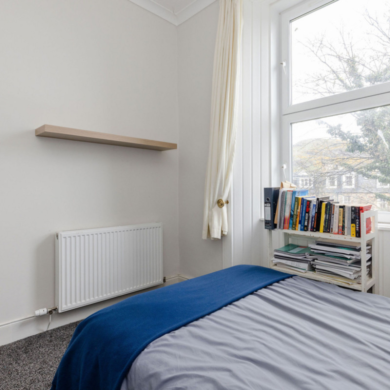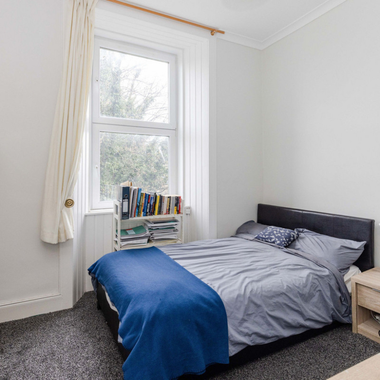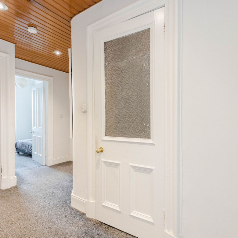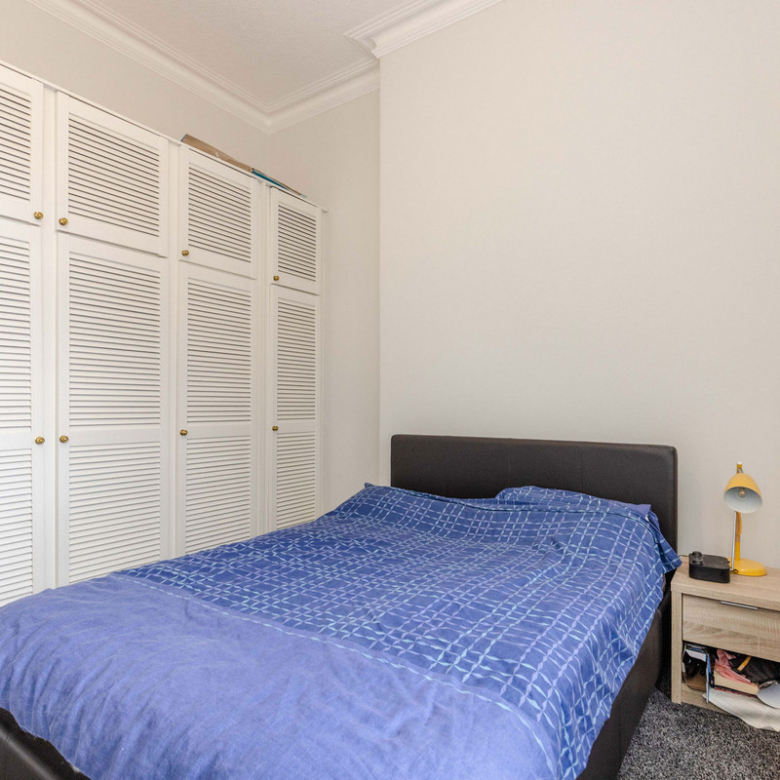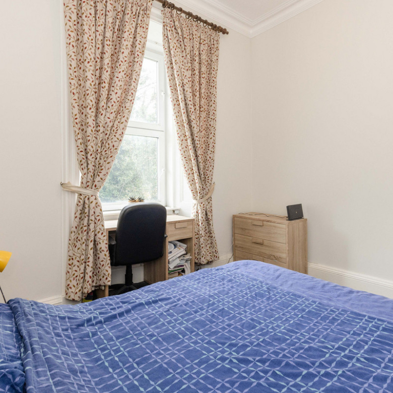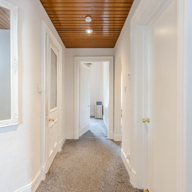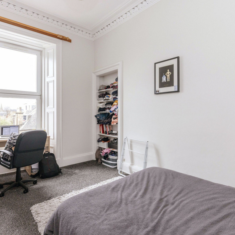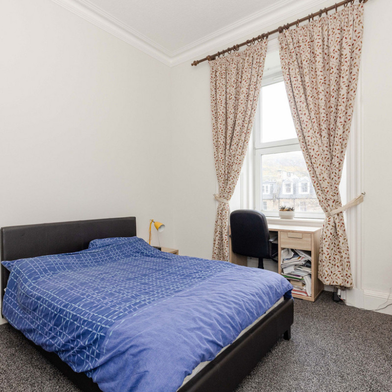 Diagonally opposite the kitchen and adjacent to the living room is a good-sized bright principal double bedroom with shelved Edinburgh press, and carpeting.