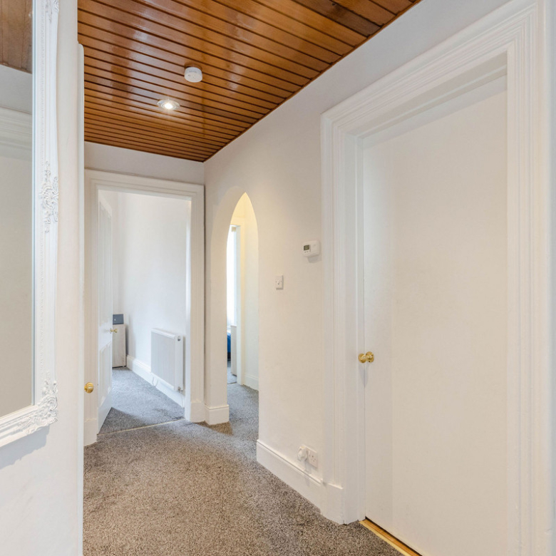 Upon entering this second floor traditional home you are drawn via the entrance hall into a spacious bay windowed living room flooded with natural light and offering front aspect views. Boasting carpeting, built-in cupboard, and a neutral décor, your eye is drawn to the ornate cornicing, high ceilings, focal mantelpiece, and an intricate ceiling rose.