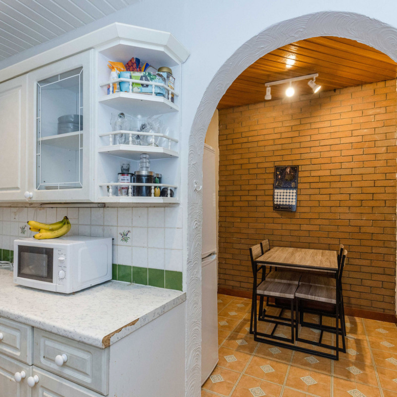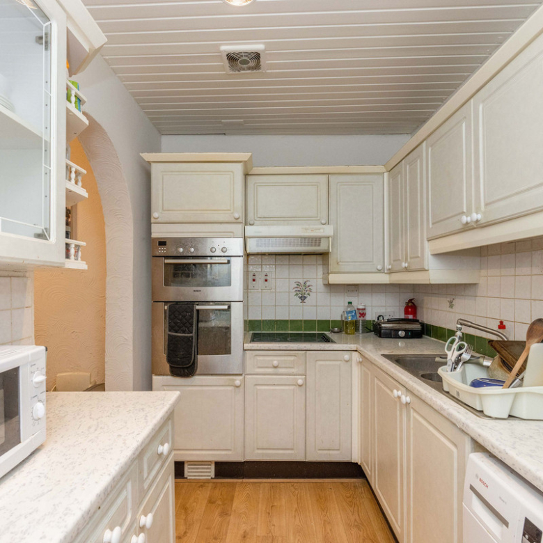 Lying next to the living room is a well-laid-out fitted kitchen with a charming dining alcove that can seat four comfortably. Ample wall and floor units sit alongside worktops, splashback tiling, and integrated appliances including a hob, eye-level grill, and oven.