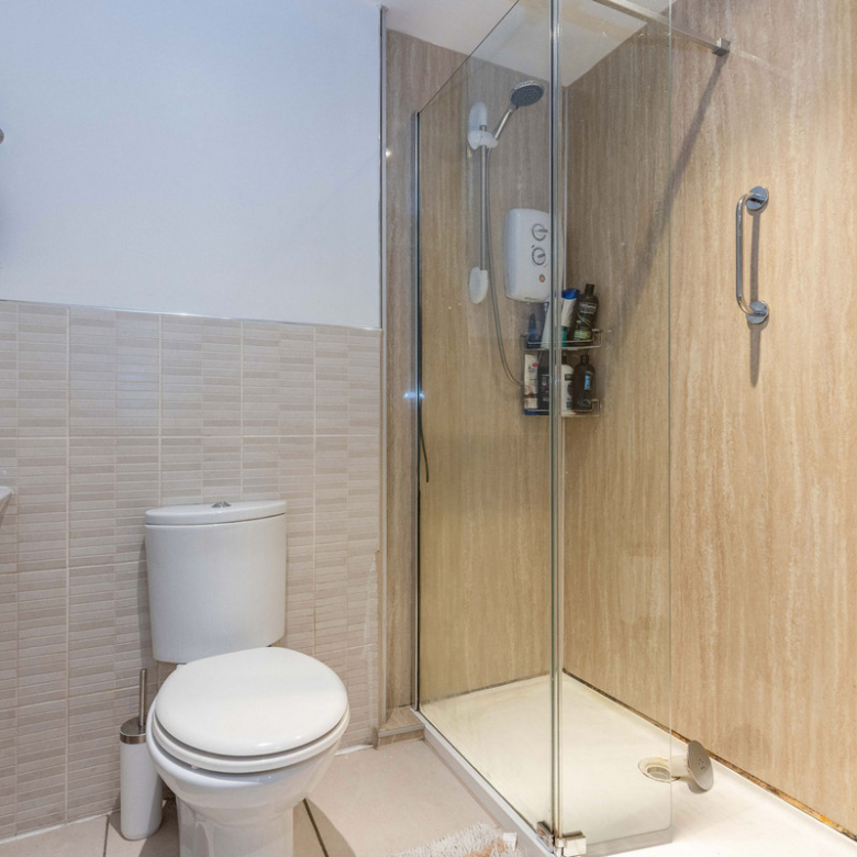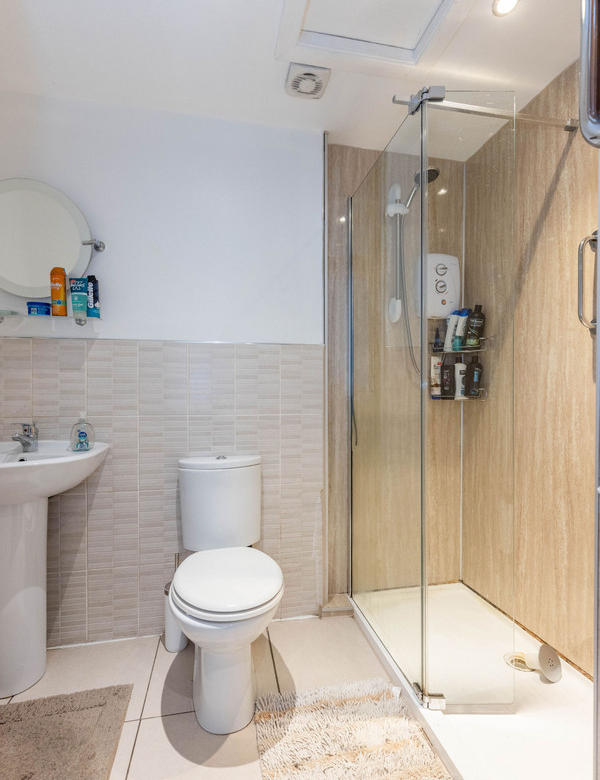 A modern shower room completes the internal accommodation with a walk-in enclosure, WC, and washbasin.