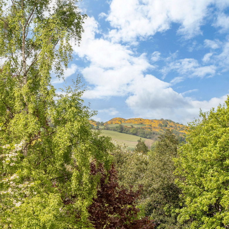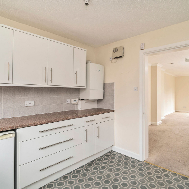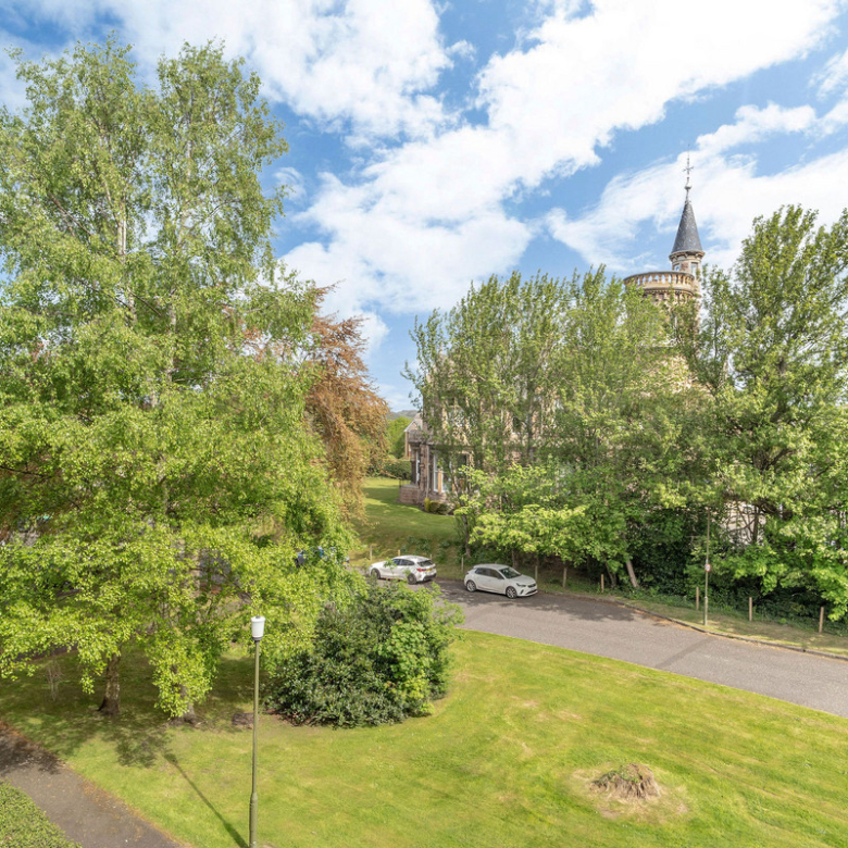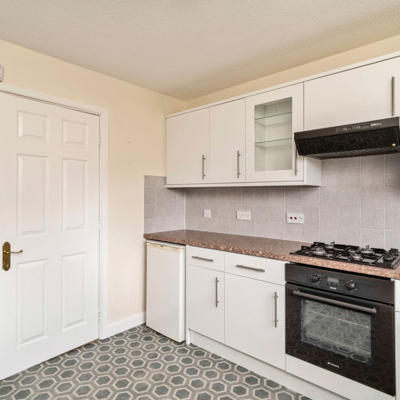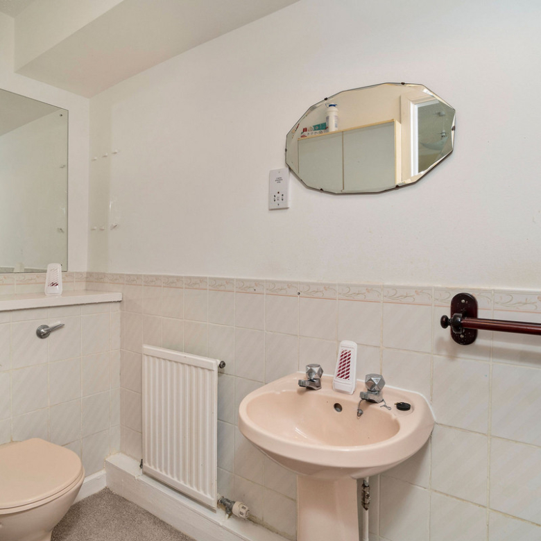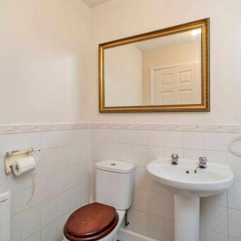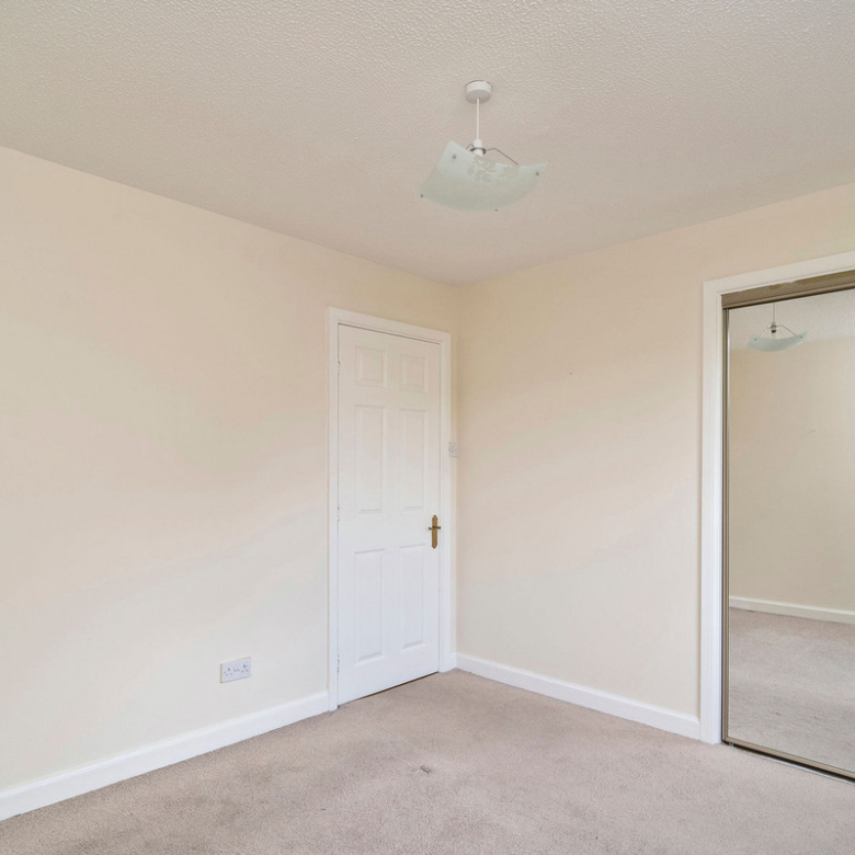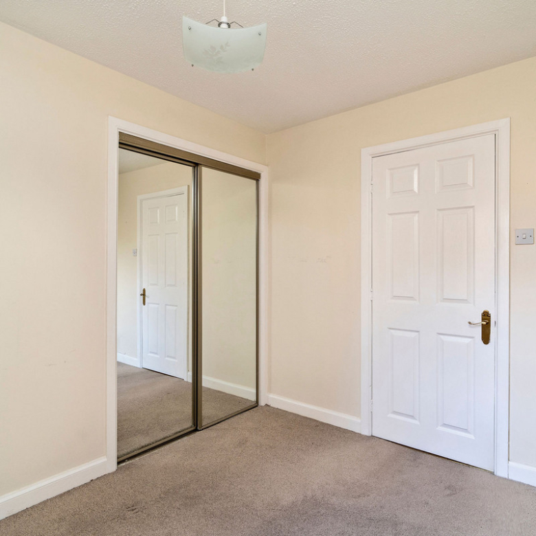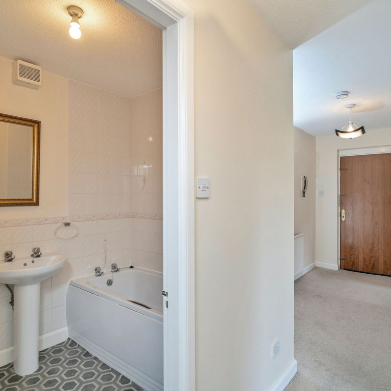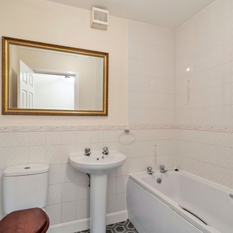 Two further good-sized south-west-facing double bedrooms mirror the principal bedroom’s stylish décor and built-in storage, and they share a family bathroom complete with a bath, washbasin, and WC. Please note this property is sold as seen.