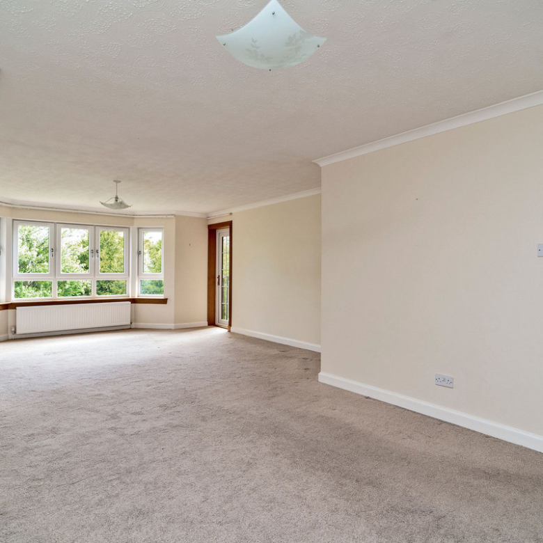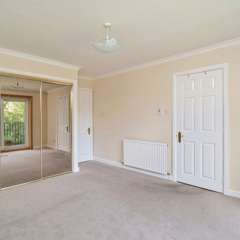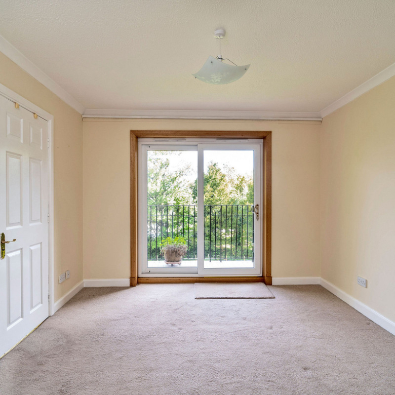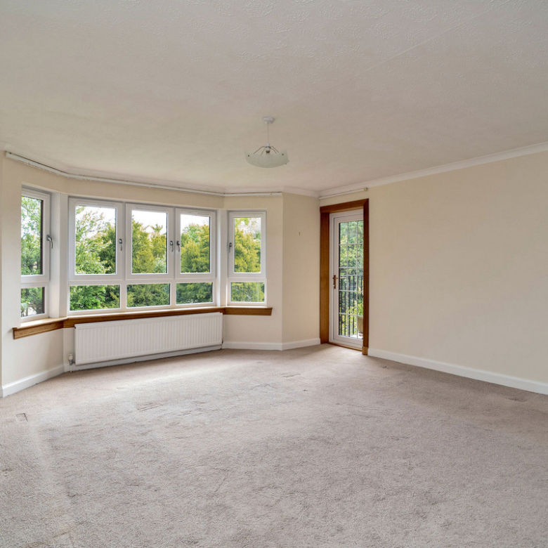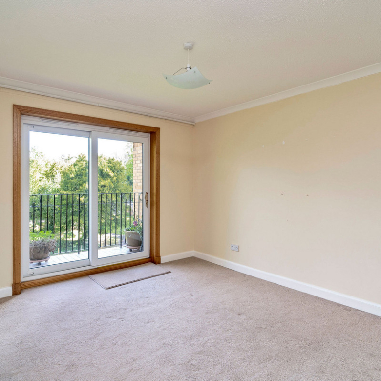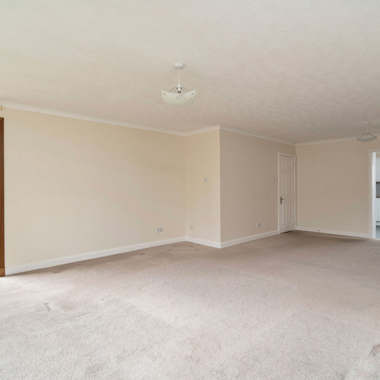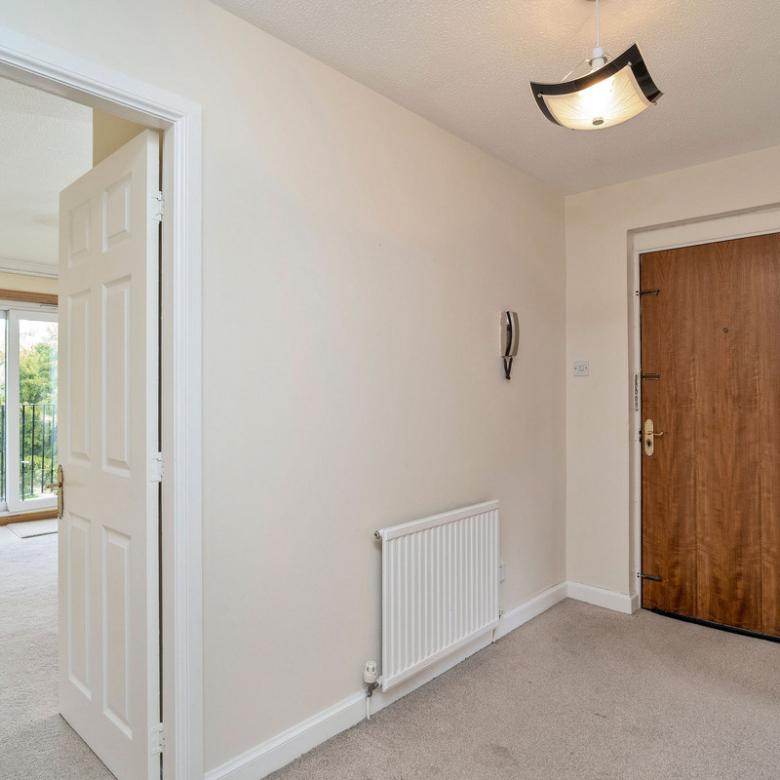 A welcoming carpeted hallway leads you into a remarkably spacious bay-windowed living room, enjoying plentiful natural light. Tastefully decorated in a soft neutral palette, this inviting space flows directly onto a private balcony with peaceful views over the shared grounds, ideal for relaxing, entertaining, or enjoying a quiet morning coffee.