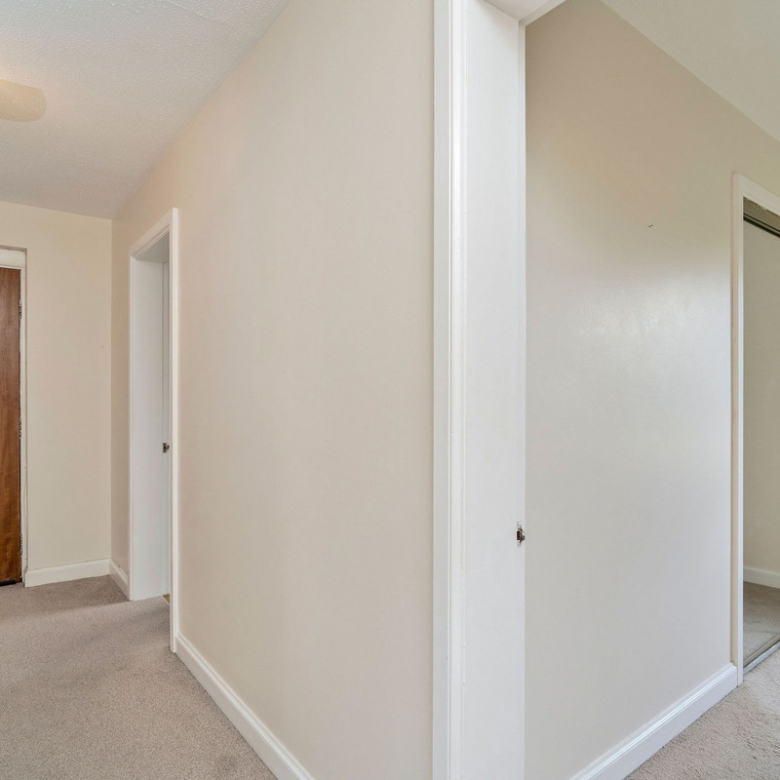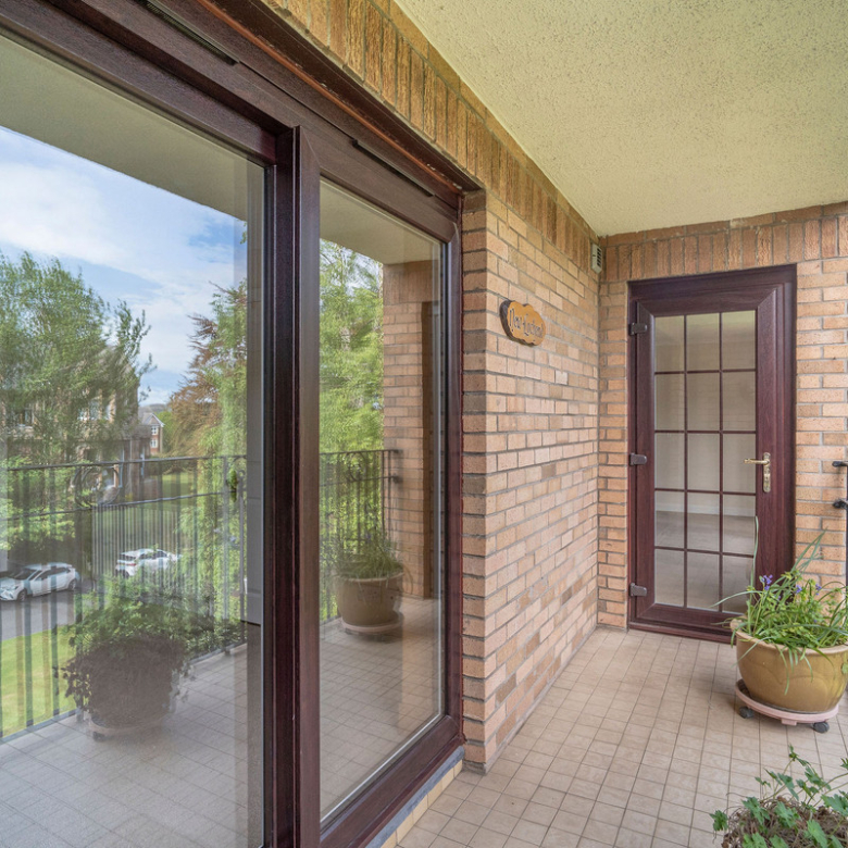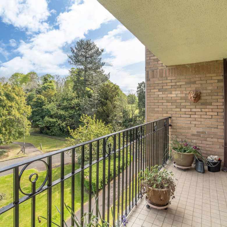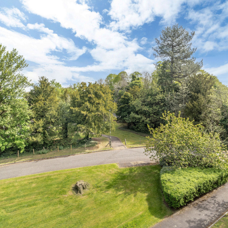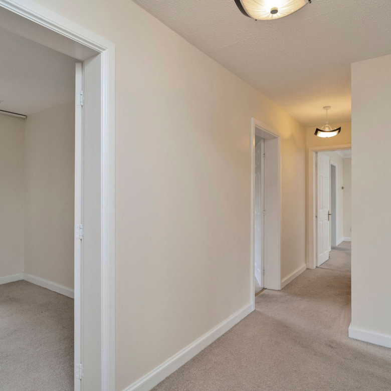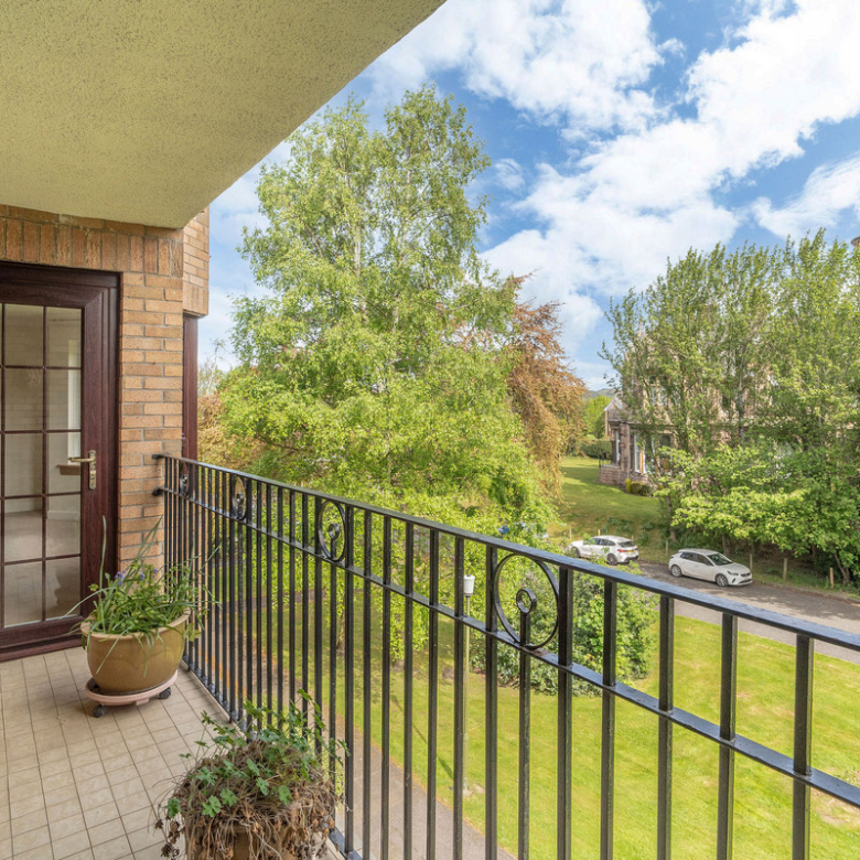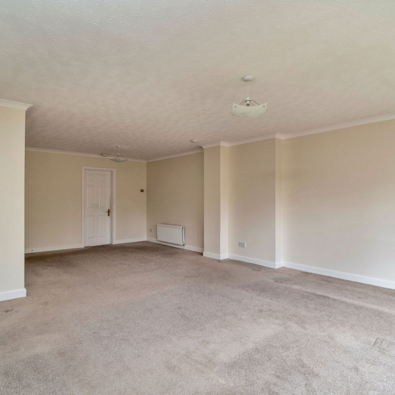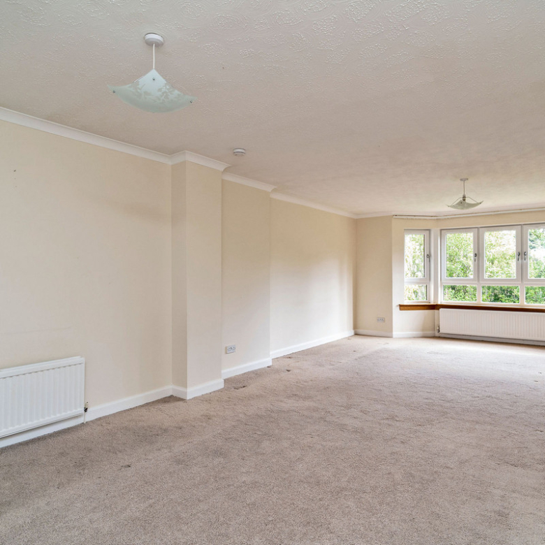 A welcoming carpeted hallway leads you into a remarkably spacious bay-windowed living room, enjoying plentiful natural light. Tastefully decorated in a soft neutral palette, this inviting space flows directly onto a private balcony with peaceful views over the shared grounds, ideal for relaxing, entertaining, or enjoying a quiet morning coffee.