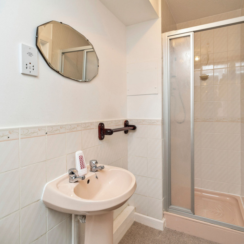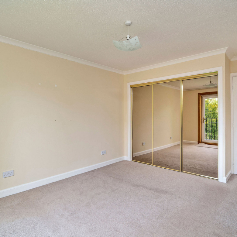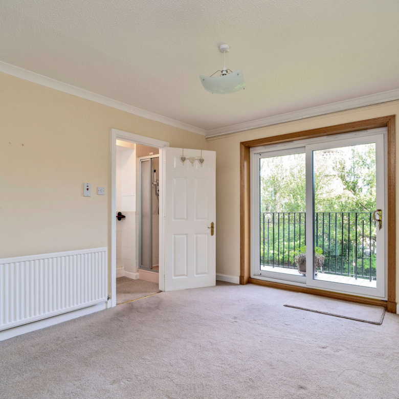 Returning to the hallway, a light-filled principal double bedroom also enjoys direct access to the balcony through sliding doors and benefits from an en-suite shower room. With built-in mirrored wardrobes, plush carpeting, and calming tones, it’s a comfortable retreat.