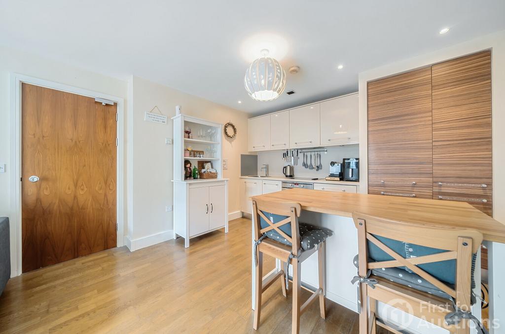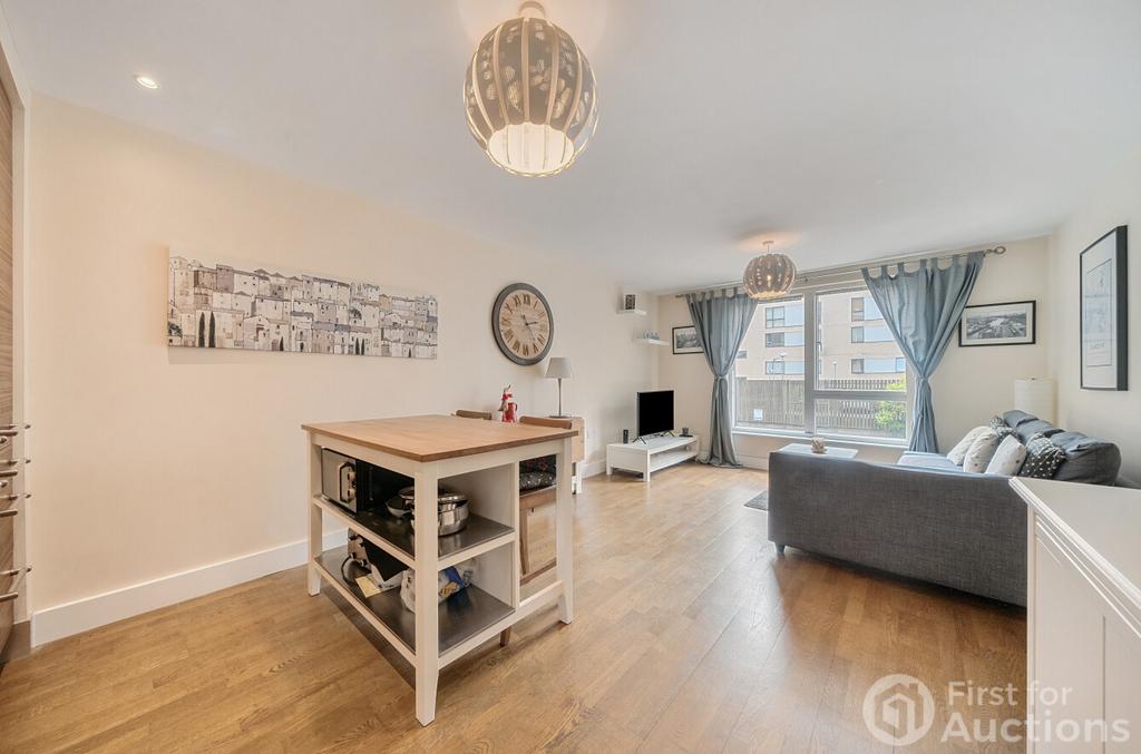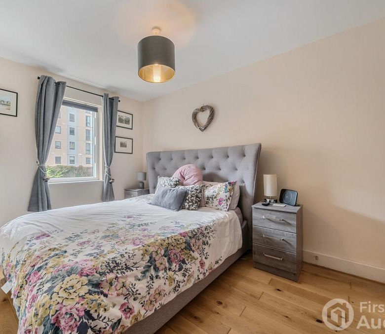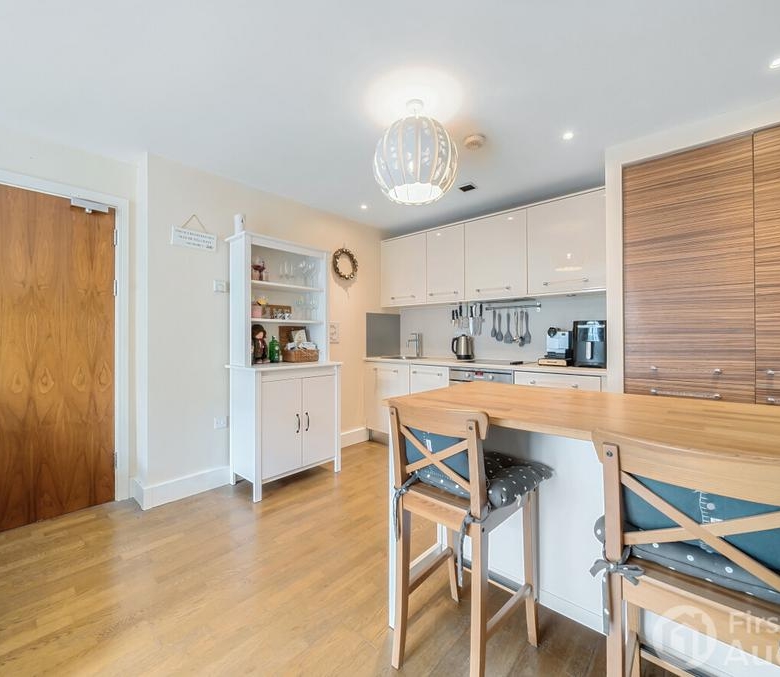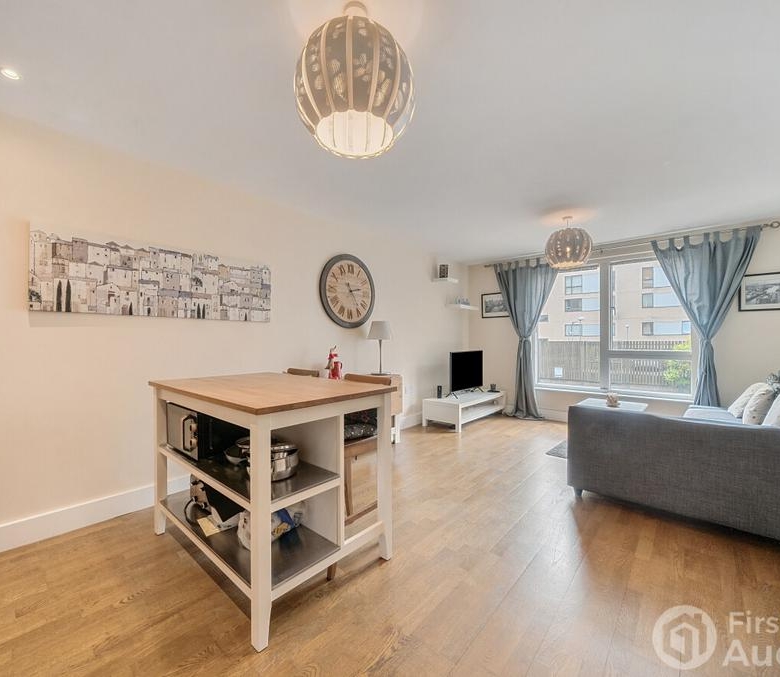 The apartment is located on the first floor and features a spacious open-plan living and dining area with oak flooring, a fully fitted kitchen, two well-proportioned bedrooms, and a family bathroom. The master bedroom further benefits from a private en-suite shower room.