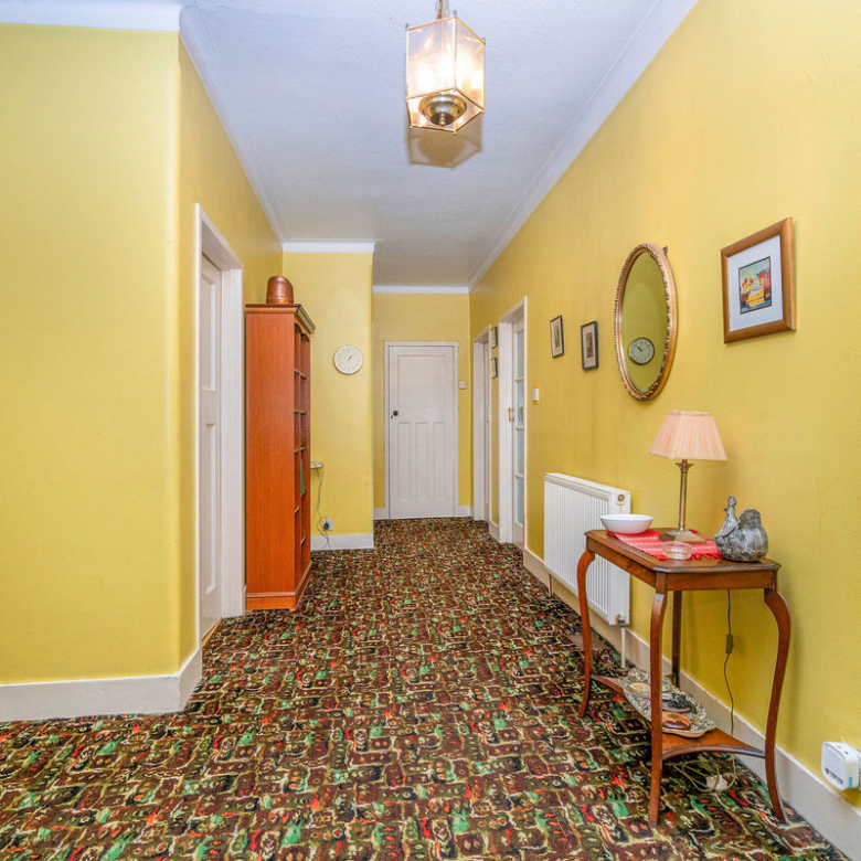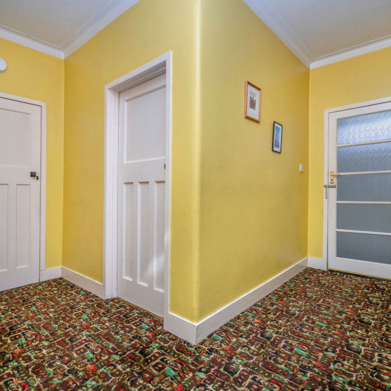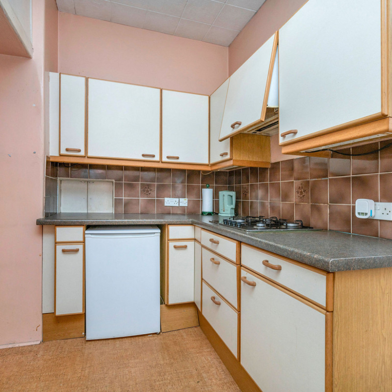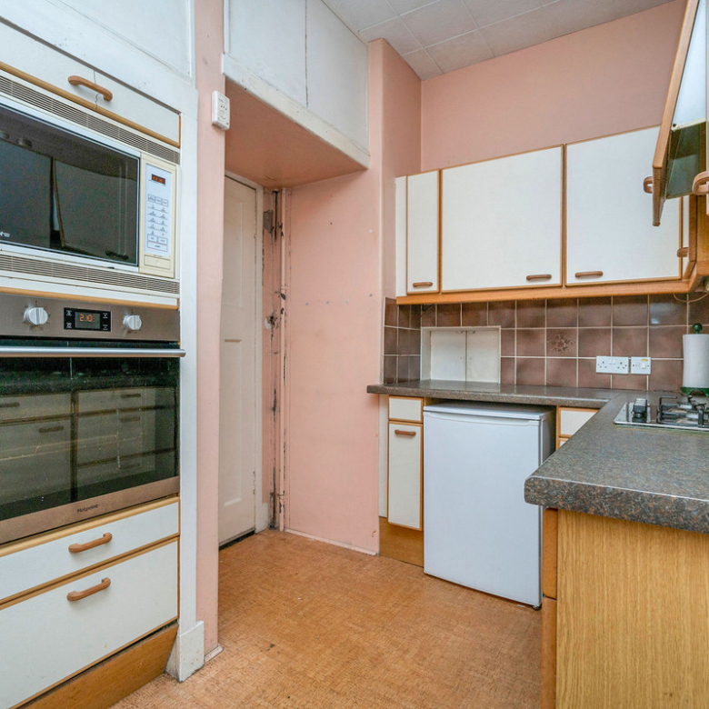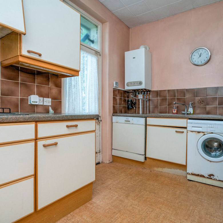 Adjacent the kitchen leading out to the rear garden will benefit from a cosmetic upgrade but currently boasts ample wall and floor units, worktop space, a tiled splashback and an integrated microwave, oven, gas hob, and extractor hood. A serving hatch through to the dining room is a unique touch.