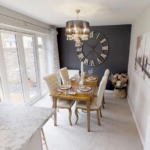 Modern in design, the kitchen is cleverly separated from the living space by a peninsula counter and features sleek white and grey gloss units, paired with a white marble-effect worktop and an aqua acrylic splashback. High-end integrated SIEMENS appliances, including a hob, oven, microwave, and extractor hood, complete the kitchen’s design.