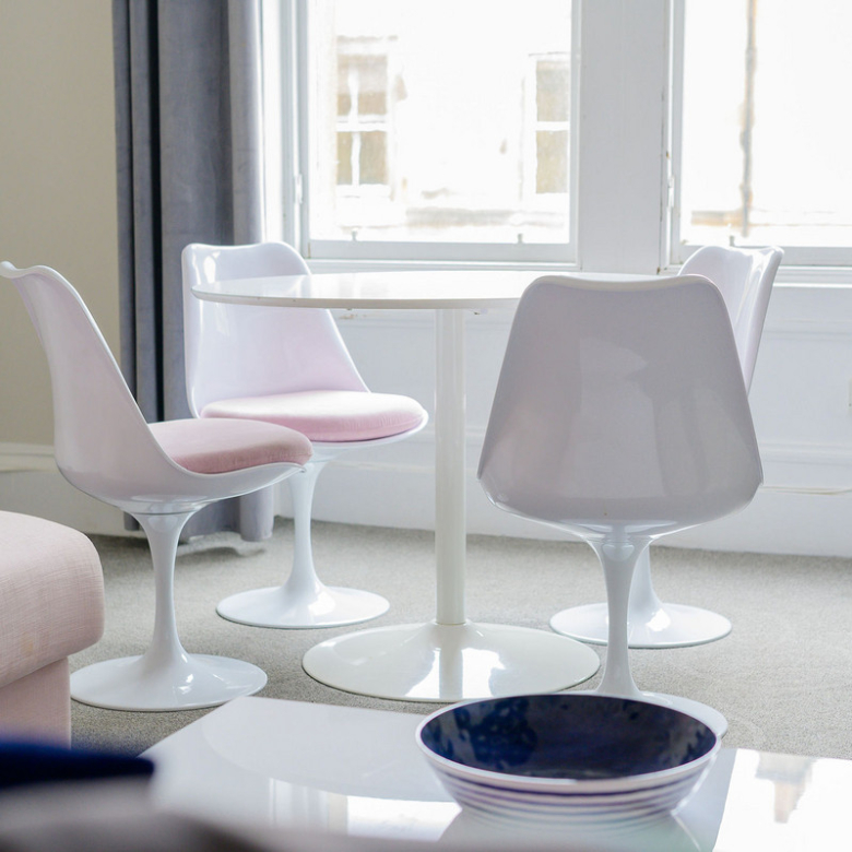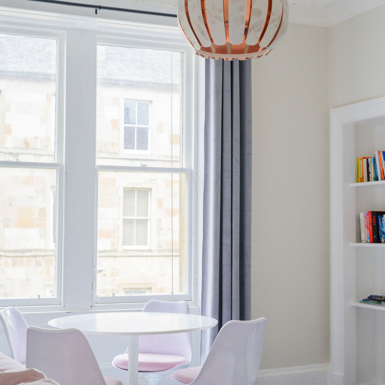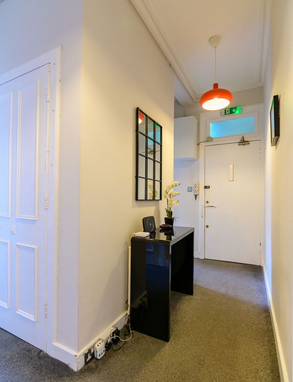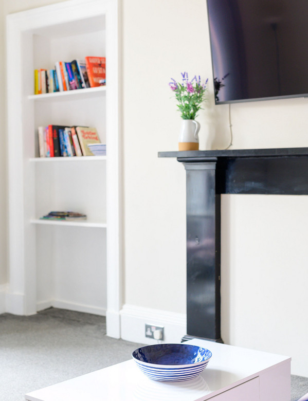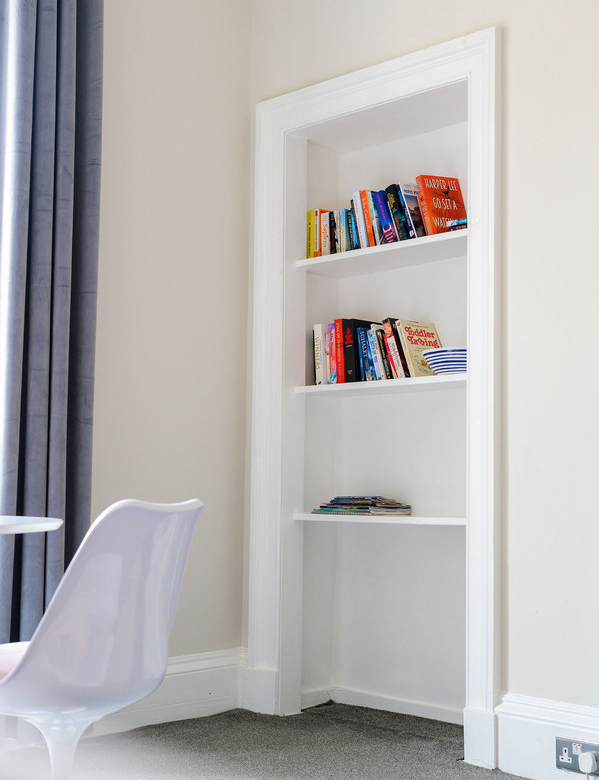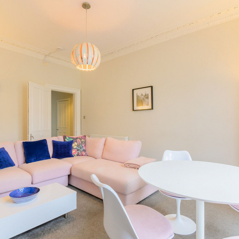 This inviting living and reception space showcases elegant period details such as intricate cornicing, a shelved Edinburgh press, twin sash and case windows, and a feature mantlepiece making it an ideal place for entertaining and relaxation. With carpeting, a tranquil colour scheme and space for dining it is a wonderful setting for friends and family alike.