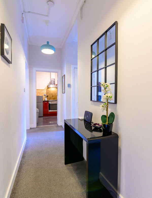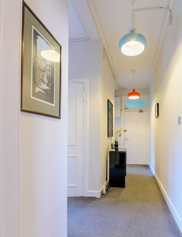 From the front door, you are welcomed into a carpeted hallway featuring a crisp décor and leading to the light-filled living room overlooking Panmure Place.
