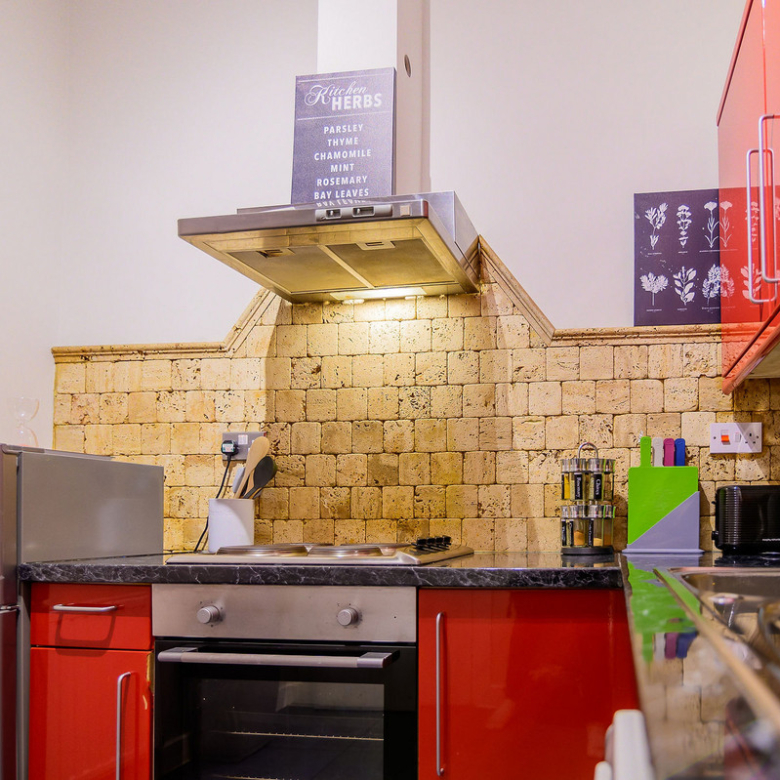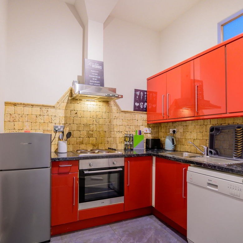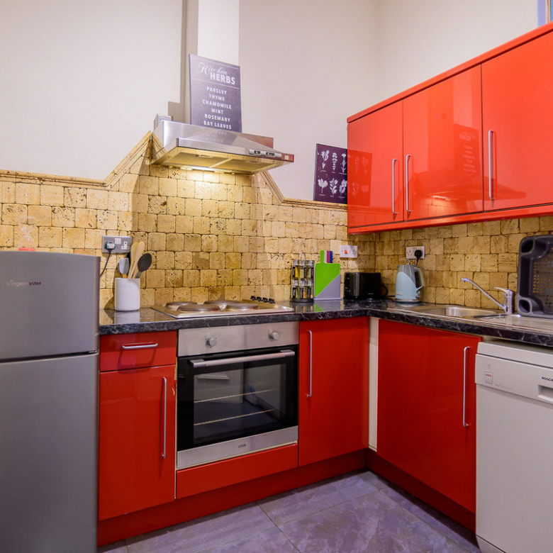 Adjacent is a modern and well-laid-out kitchen featuring red gloss wall and floor units, black marble-effect worktops, and integrated appliances including an extractor hood, oven, and hob.