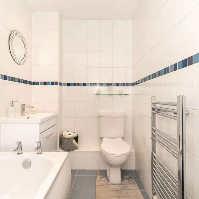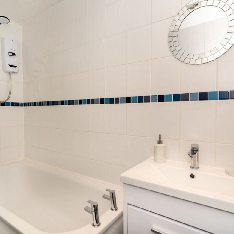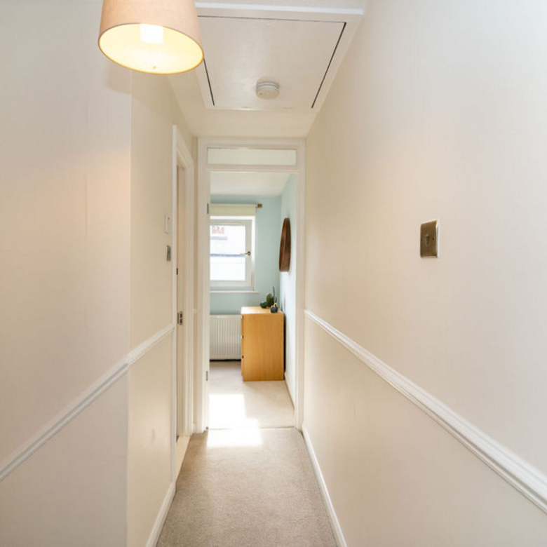 The fully tiled bathroom connects both rooms and consists of a corner suite bath with shower and some storage space beneath the sink. In the landing you can find some loft space which welcomes further storage, including a small cupboard.