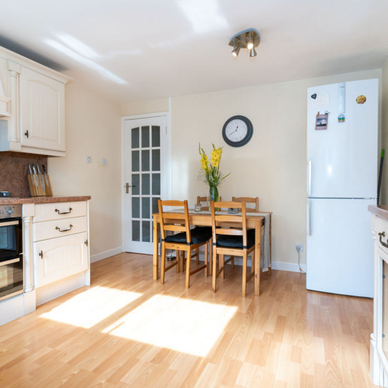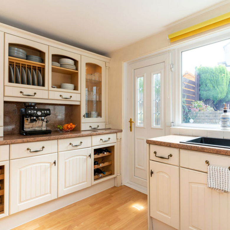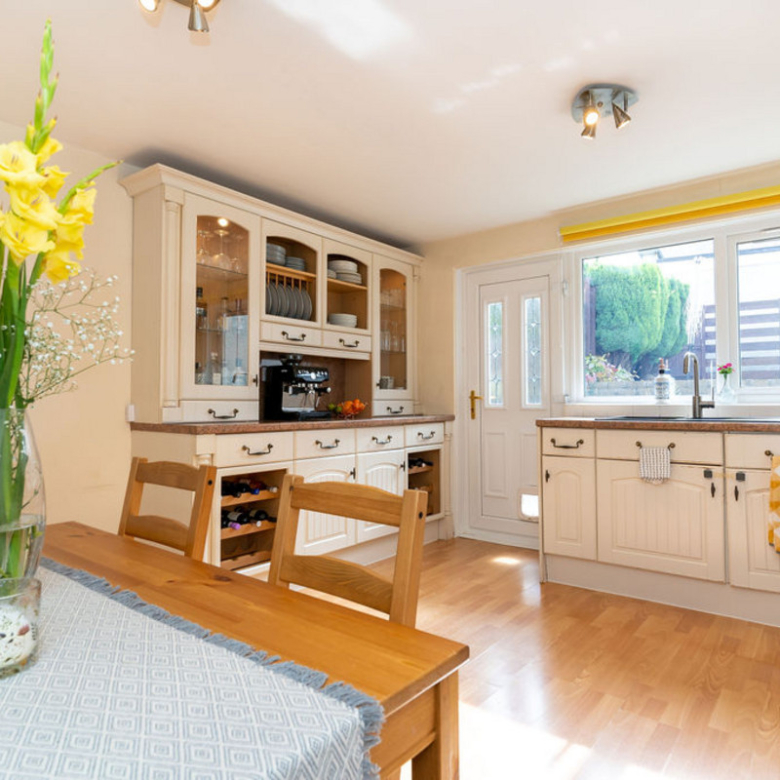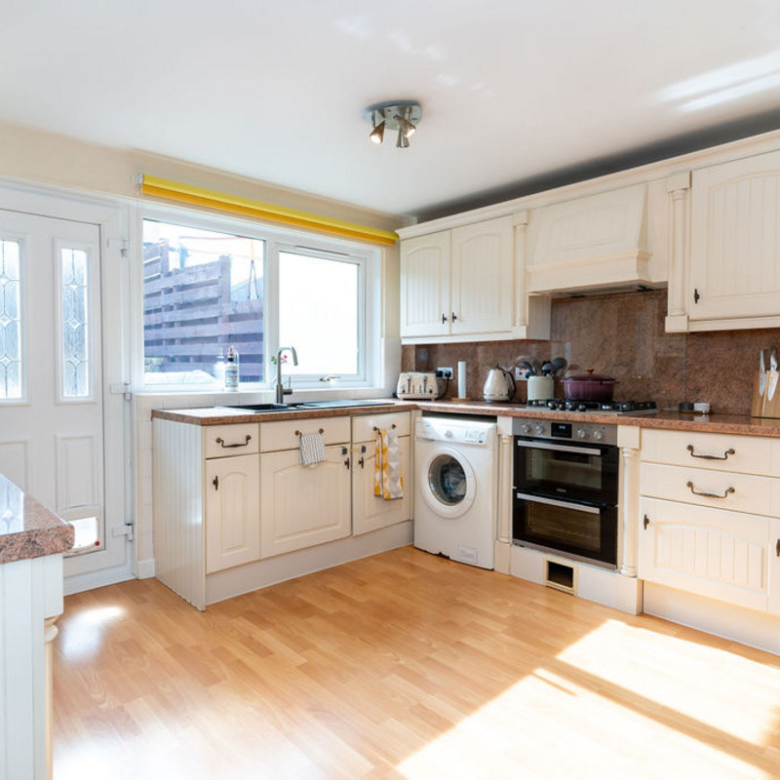 Through to the beautiful traditional kitchen you can find cream units surrounding a four-ring gas hob, extractor hood and space for a washing machine and standing fridge/freezer. There is plenty of room to have a dining table and chairs also.