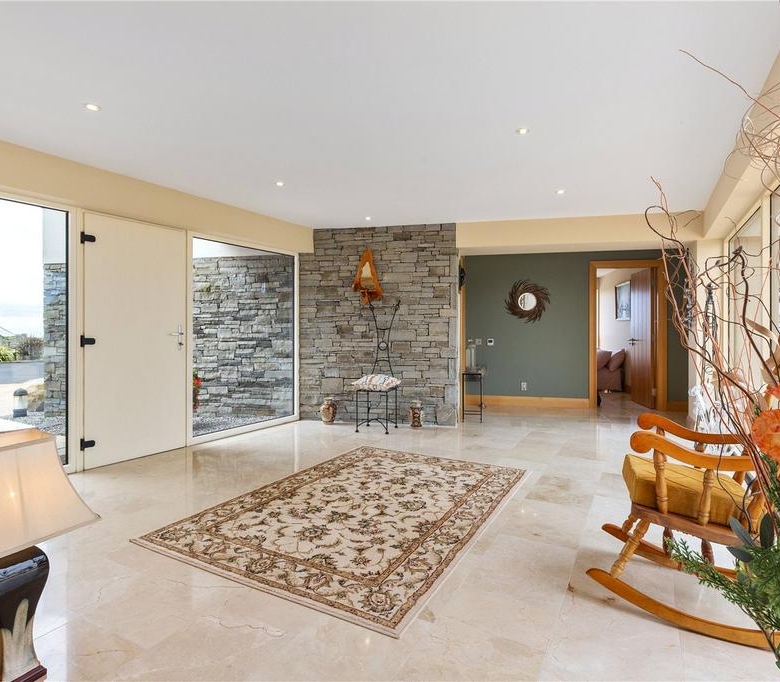 Accessed off a quiet country road, an electric gated entrance leads onto a gravelled driveway and a parking area beside the house. The front door opens into an impressive entrance hallway featuring floor to ceiling glass windows and marble flooring. The home has been cleverly designed to separate the living and bedroom areas while allowing both spaces to flow effortlessly. The entrance hall connects to a hallway which provides access to the sitting room and the office. The sitting room has a feature gas fireplace while the office provides flexible accommodation.