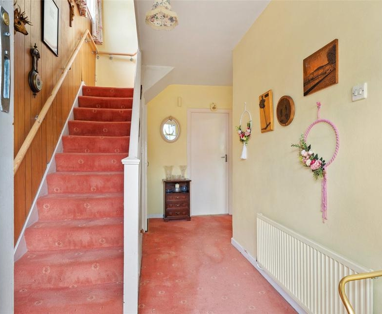 The ground floor features a wide, welcoming entrance hall leading to a large, bright sitting/dining room with views of the front and rear gardens and an open fireplace as its focal point. Further along the hall is a kitchen/dining room with fitted units, opening into a sunny conservatory overlooking the long, private south-facing garden — a true highlight, filled with mature trees, shrubs, and flowers, and basking in all-day sunshine.