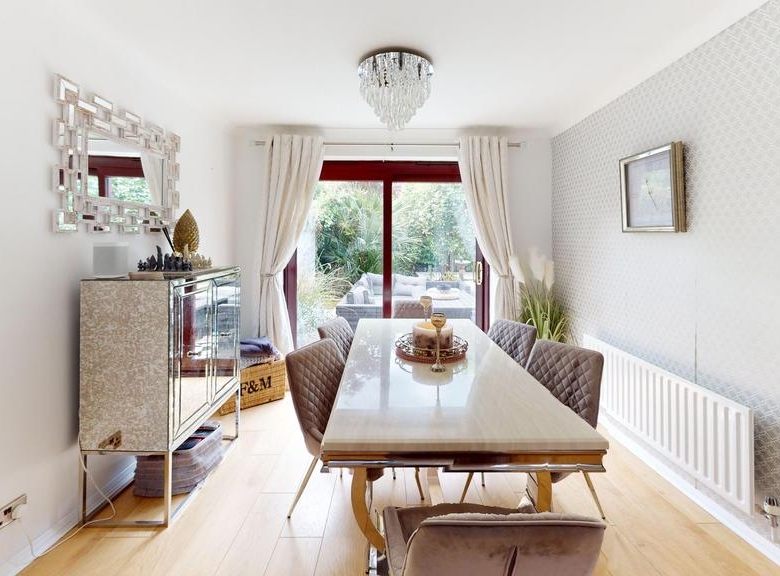Lounge and dining room: with wood laminate floor and patio doors to the rear garden