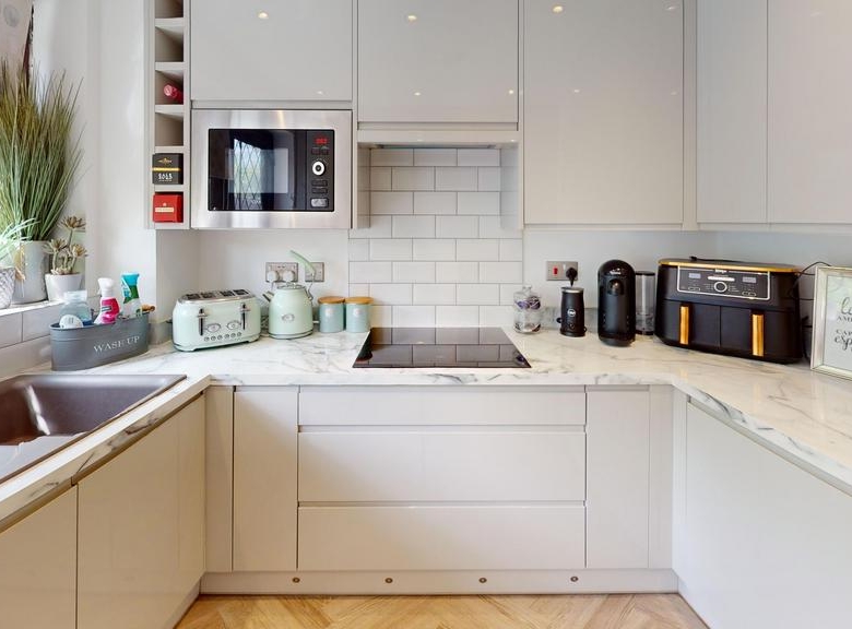 Utility room with kitchen units and under counter washing machine and dryer; grey laminate floor
