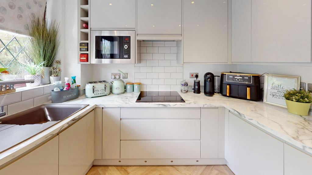 Kitchen: wall and floor mounted kitchen units with integrated Bosch oven, integrated fridge and freezer, and integrated AEG dishwasher, pull out larder cupboard, Worcester combi gas fired boiler; door to rear garden; wood laminate floor and tiled splash back