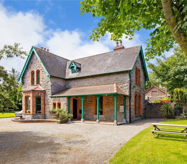 Set in mature landscaped gardens and adjoining Rush Cricket Club, this former Church of Ireland rectory is a home full of character and history. Designed in 1866 by the well-known architect James Edward Rogers, who also designed the nearby Kenure Church, this detached house with a half-dormer attic is a fine example of 19th-century design. The house has a T-shaped layout with a pitched slate roof topped by terracotta ridge tiles. Limestone chimneys with red brick detailing rise above the roof, while timber bargeboards, cast-iron gutters, and exposed timber beams add to its charm. The exterior walls combine red brick and rough limestone, giving the house a strong and stylish look. Tall pointed windows with red brick surrounds and timber sashes let in plenty of natural light and reflect the home’s historic past.