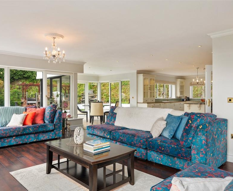 Stepping inside the front door with overhead fanlight reveals a welcoming hallway with a beautiful staircase with Mahogany monkeys tail and swan neck balustrade with intricate ironworks. To your right, you will find a comfortable and private living room with fireplace which could also be used as a fourth bedroom. To the left, you will find a light filled and spacious open plan kitchen/dining/living room with clear sea views. This room benefits from cornicing a marble fireplace with stove and solid wood floor. Moving into the kitchen reveals an abundance of storage space, marble worktops, a large island unit with additional storage and recessed lighting. Here, you will also find a spacious utility room and guest lavatory.