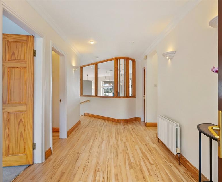 A wide, welcoming hallway sets the tone for the generous proportions throughout. To the left lies a good sized home office/study – perfect for remote work. Beyond, the open-plan kitchen/dining room enjoys harbour views, a fully fitted kitchen with island, and patio doors to a full-length patio: the ideal spot for alfresco dining under ever-changing skies.