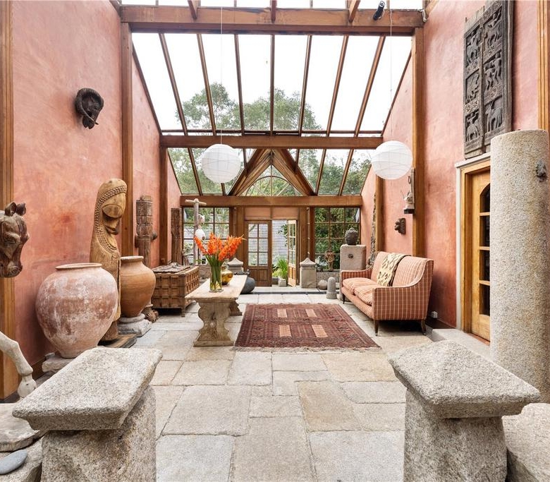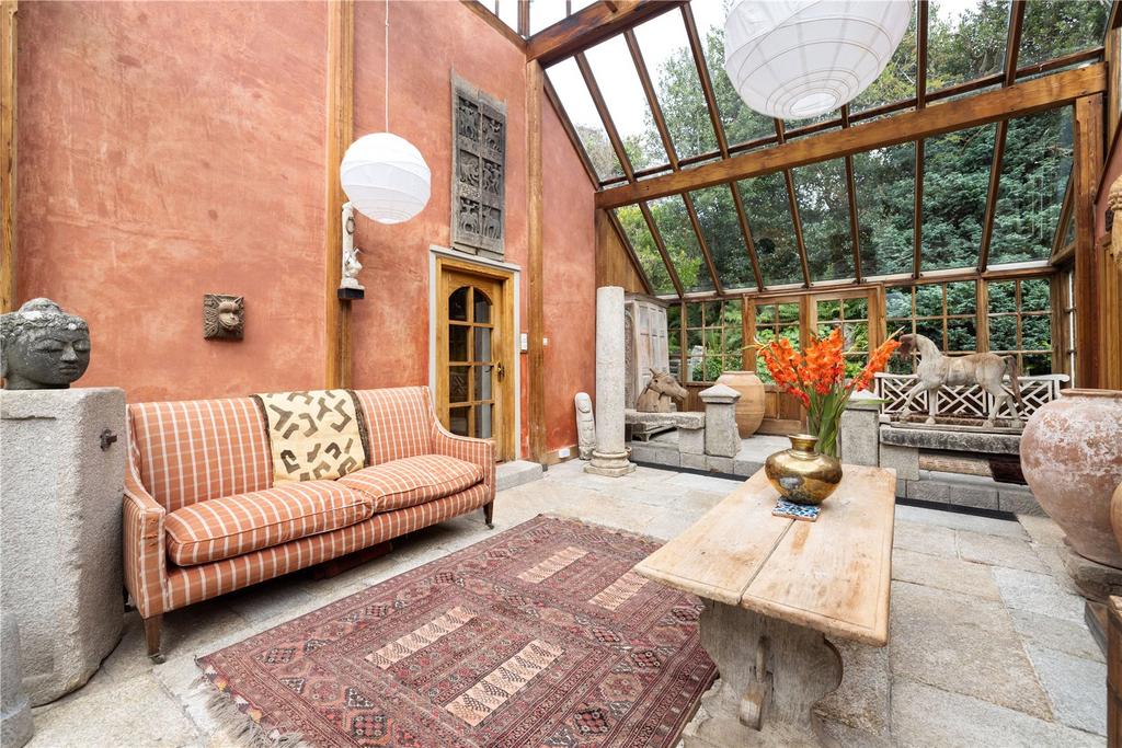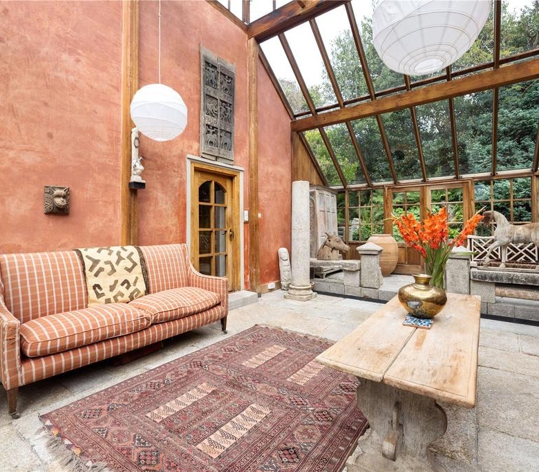The house has an abundance of glazing affording beautiful natural light throughout. The double height ceilings supported by reclaimed wooden beams (king posts) add to sense of volume in the principal rooms of the house. An ornate and artistic style is carried beautifully through from the living quarter to the living area. The room is further enhanced by bespoke brass curtain rails. The gorgeous layered interior design and beautifully designed gardens have been featured in many interior and garden publications.