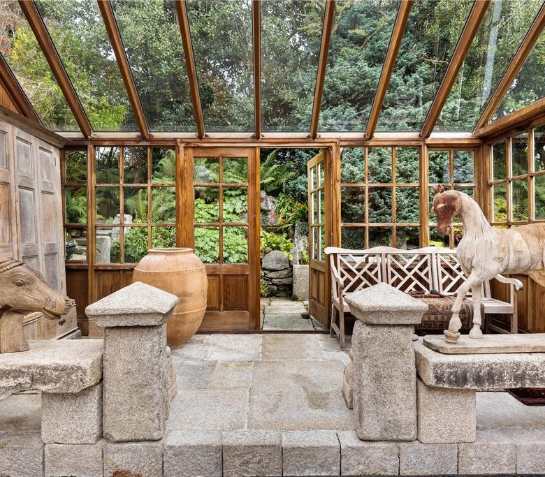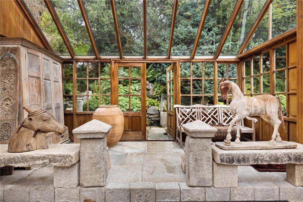Set across a series of staggered terraces on Paddock Hill, the gardens are a breath-taking expression of natural beauty and thoughtful design. Inspired by William Robinson the naturalistic garden designer and the work of architect Edwin Lutyens, the grounds are both unique and privately situated. Visitors are welcomed by Corkscrew Hazel trees and a sculptural water feature at the entrance. The mature gardens are rich with herbaceous borders, rockeries, and granite stone features. A diverse array of flora flourishes throughout, including creeping hydrangea, wisteria, roses, Solomon’s seal, and a striking peony tree, all interwoven with oak, beech, magnolia, and hazelnut woodlands. Several granite patios and seating areas are thoughtfully placed throughout the property along with rockeries and a pond.