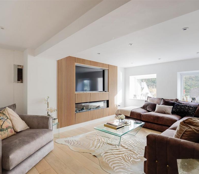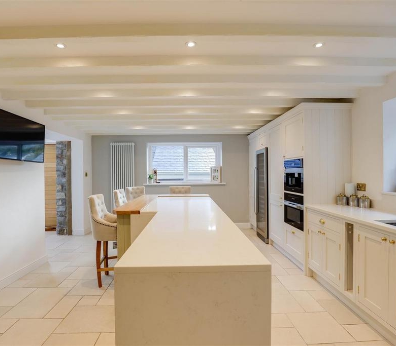 About The Property – Located in this much sought after of villages, Graig House has been recently modernised by the current owners to offer a dramatically improved family home of ………sq.ft. Fronting the property is a garden room / dining area with lantern light over from which to look over Graig Penllyn village. This dining area links directly into the kitchen, a large space fitted with an especially good range of contemporary ‘Topstak’ units with matching central island/breakfast bar. Appliances, where fitted, are to remain and include: an electric, 4-oven ‘Everhot’ range cooker with hotplate and induction hob; fully integrated fridge, freezer, dishwasher; ‘Miele’ coffee machine and microwave. A temperature-controlled wine fridge is also to stay. To the rear of the kitchen is a neat laundry room with space and plumbing for a washer and a dryer, deep Belfast sink and additional storage. A rear entrance hallway links through to the side of the property and also leads into a ground floor shower room/WC. An open arch leads from the kitchen/breakfast room into the large family lounge to the very heart of the home. This features a stylish wood burner set upon a raised, tiled hearth. A bespoke staircase with glass balustrading leads to the first floor while double doors open to a second, enlarged sitting room. This is a wonderfully useful family space features a slatted timber panelled wall with TV within and flame effect fire beneath.