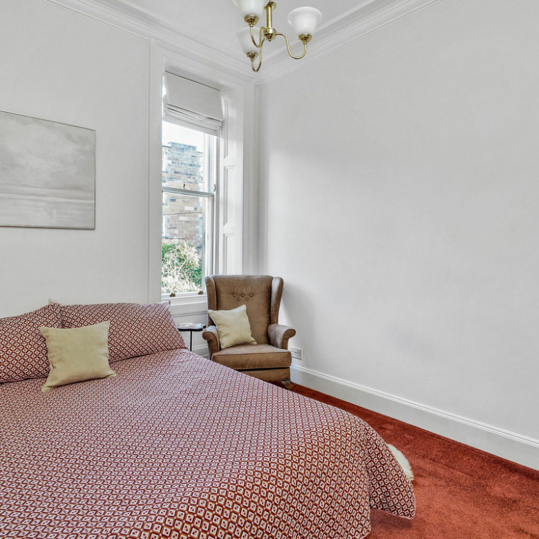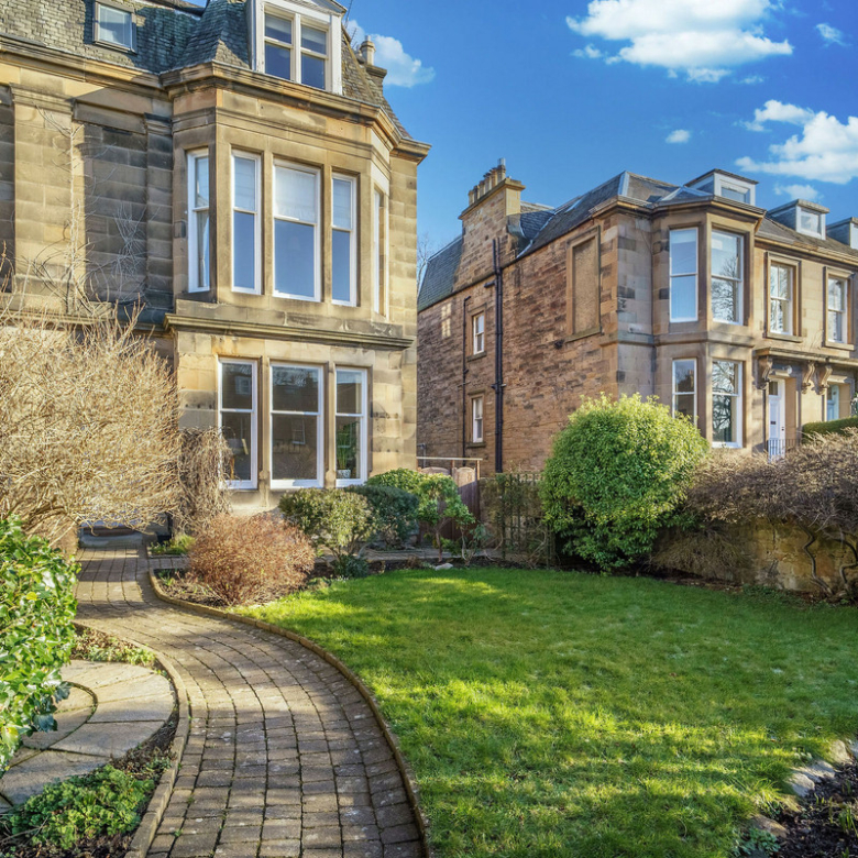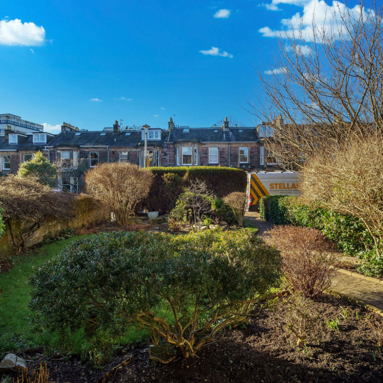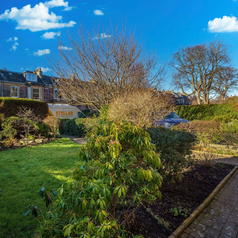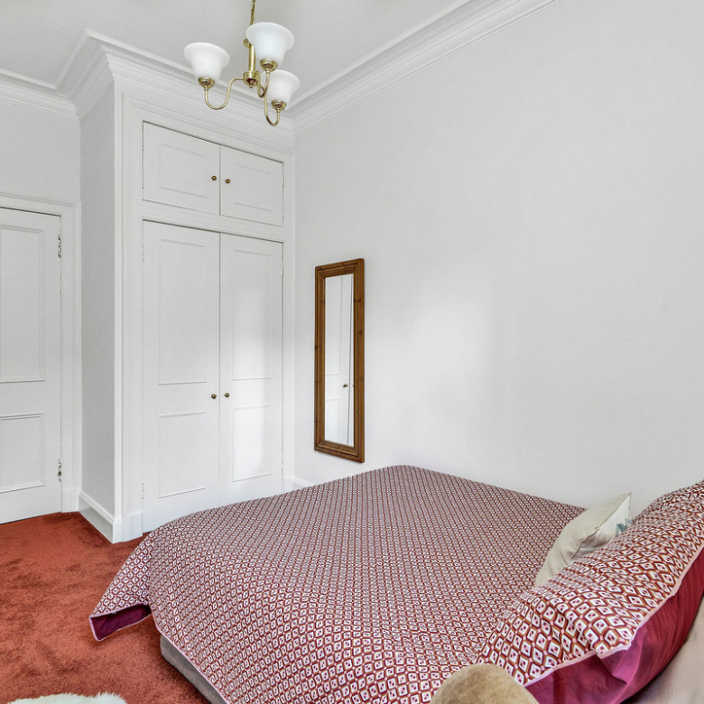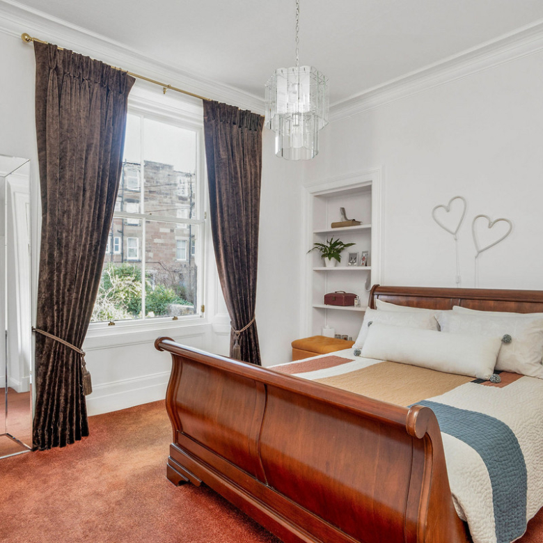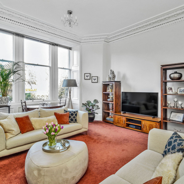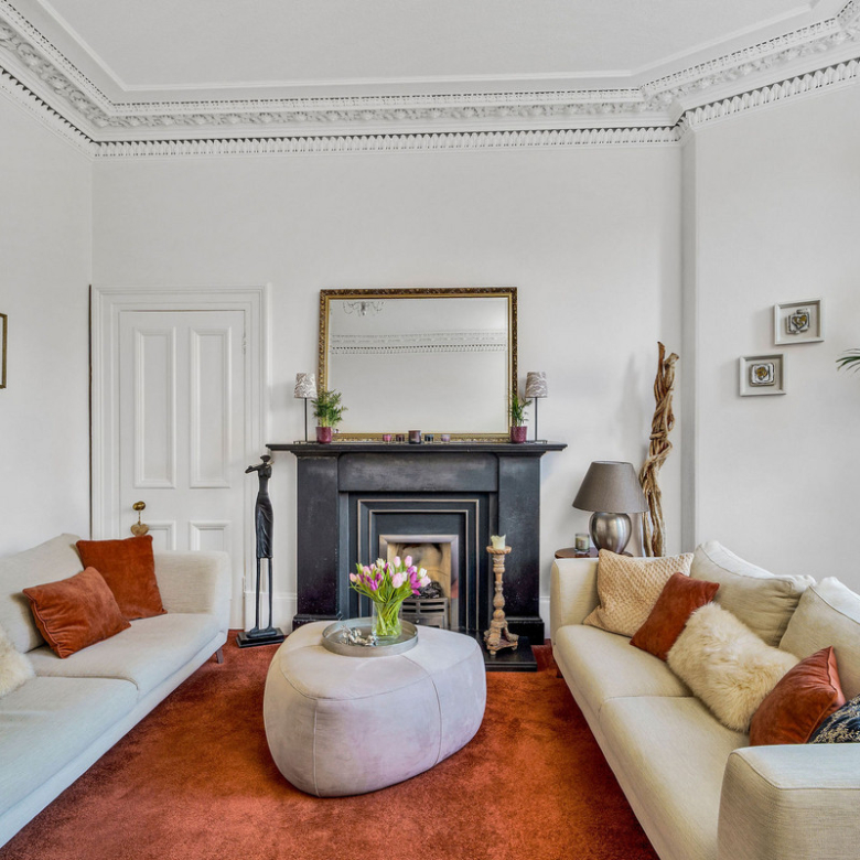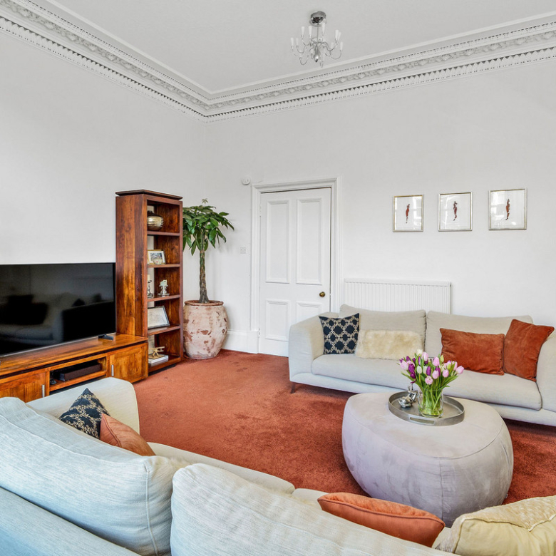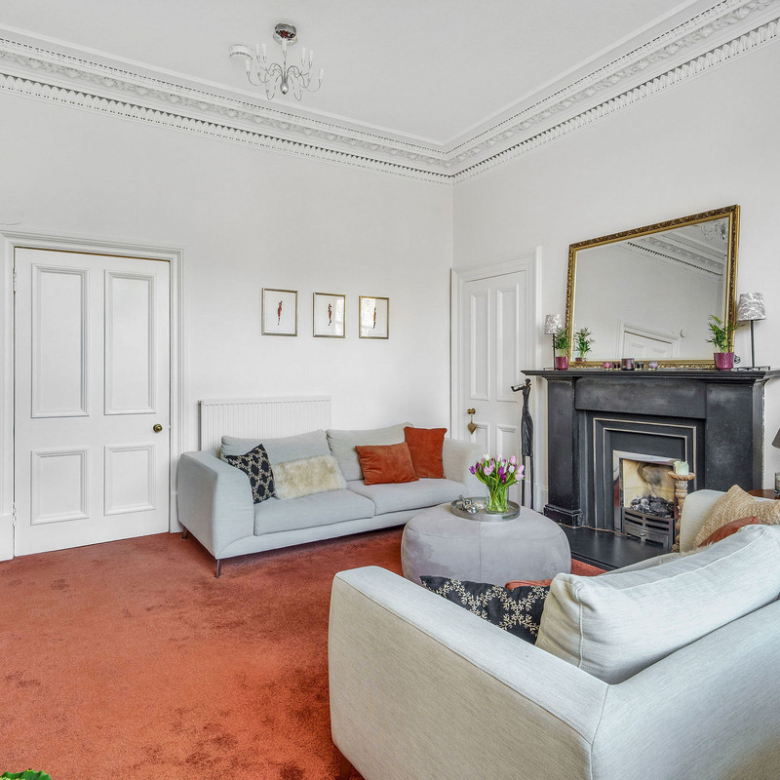 To the right, a west-facing living room showcases triple windows overlooking the garden, filling the space with natural light and providing a tranquil aspect. Intricate cornicing and a high ceiling ensure a sense of timeless elegance whilst plush carpeting, a crisp neutral décor, and a living flame fireplace in a striking black mantle create a warm ambiance. There is a useful Edinburgh press.