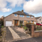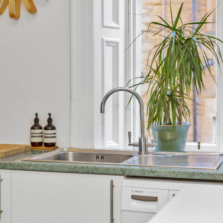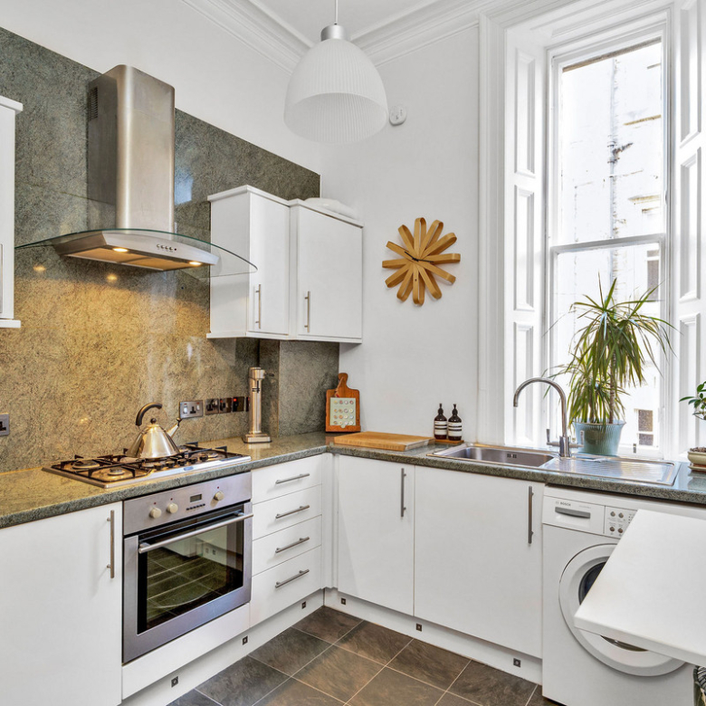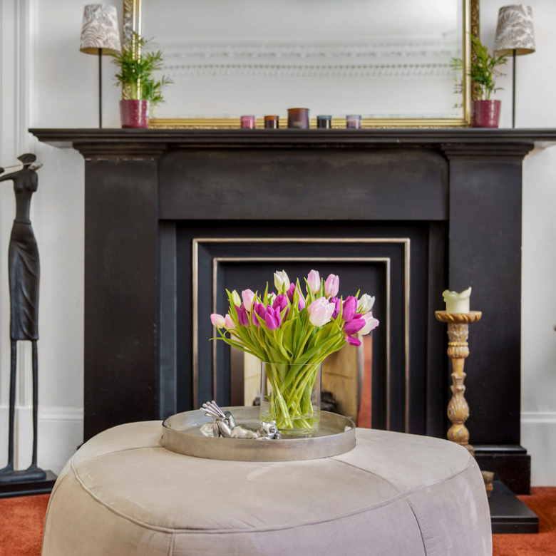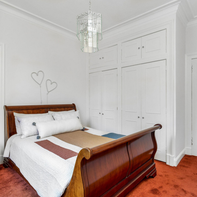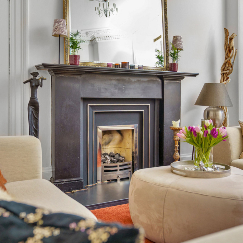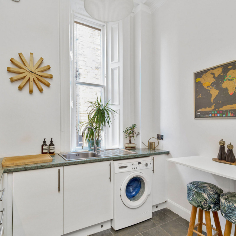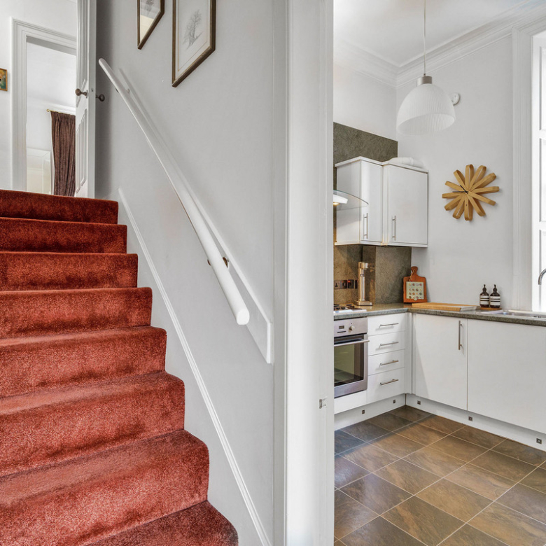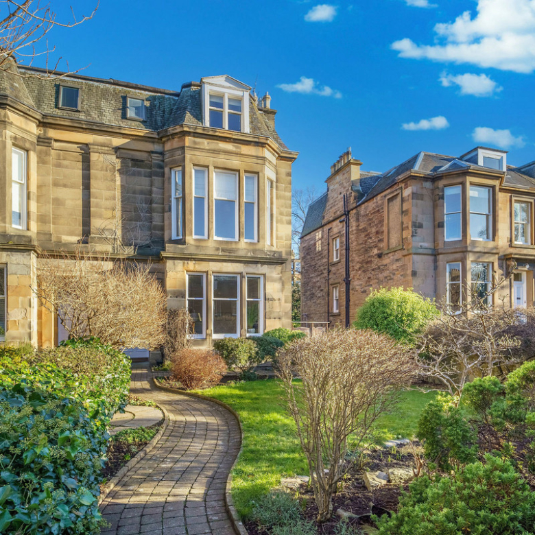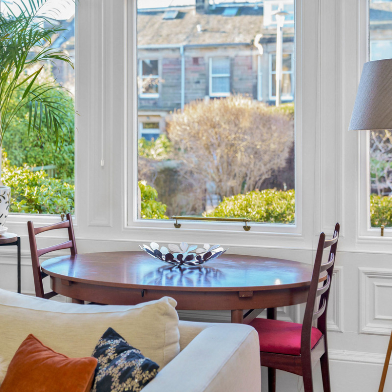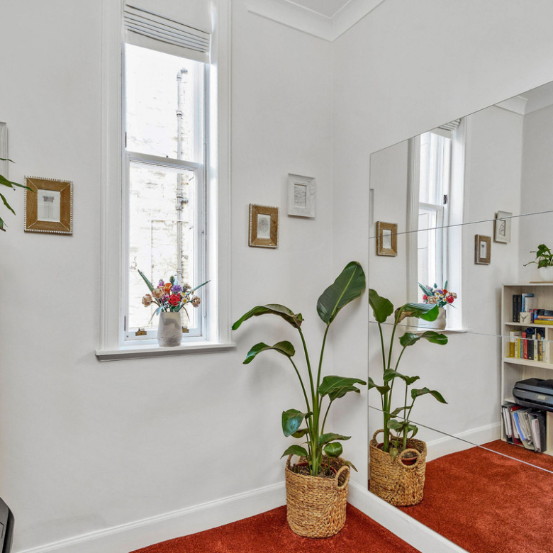 To the right, a west-facing living room showcases triple windows overlooking the garden, filling the space with natural light and providing a tranquil aspect. Intricate cornicing and a high ceiling ensure a sense of timeless elegance whilst plush carpeting, a crisp neutral décor, and a living flame fireplace in a striking black mantle create a warm ambiance. There is a useful Edinburgh press.