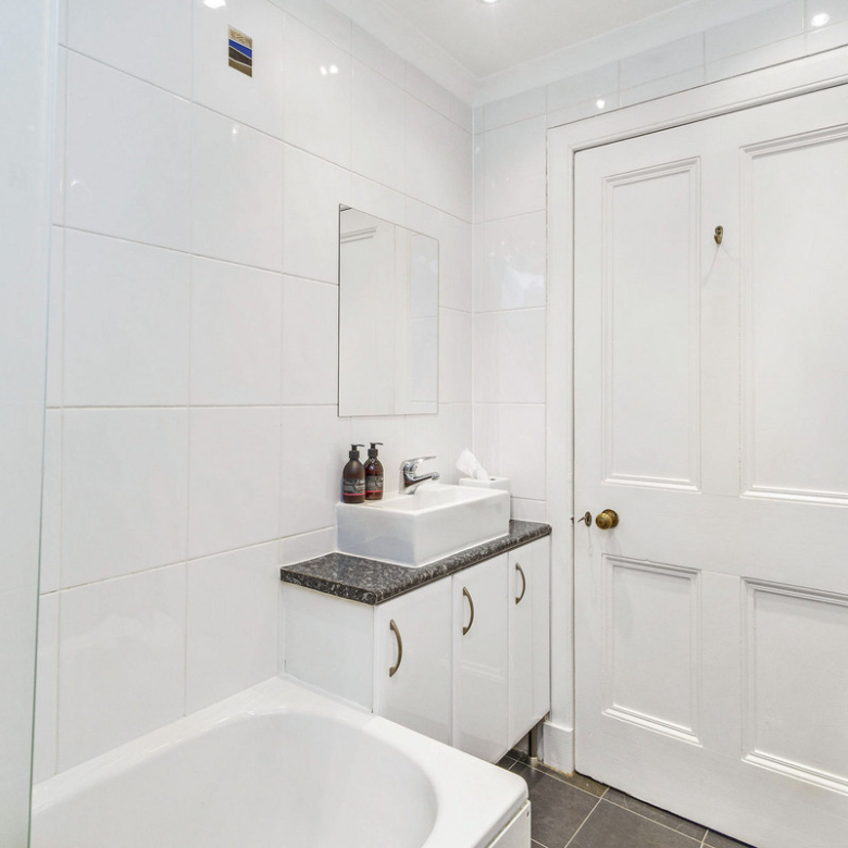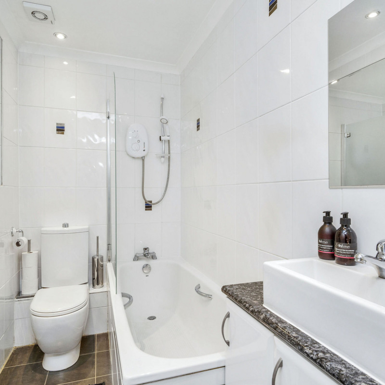 Beyond the living room, a fully tiled bathroom with a countertop washbasin, WC, and bath with wall-mounted shower is followed by a modern south-facing kitchen with seating for two.