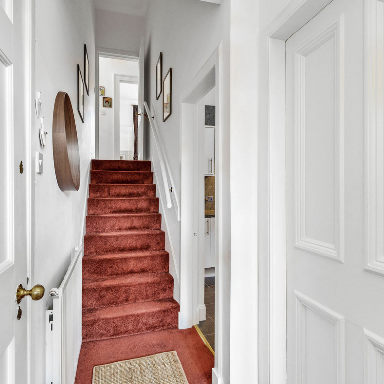 A small, carpeted staircase then takes you to a second hallway that leads to three versatile, tastefully decorated, and comfortable bedrooms, a large single and two doubles. The latter of which benefit from an easterly aspect to the rear and built-in wardrobes.