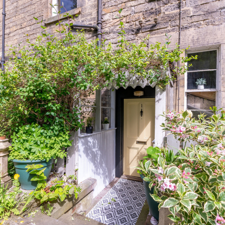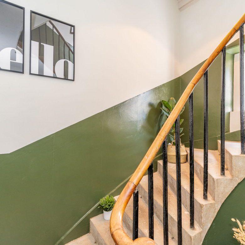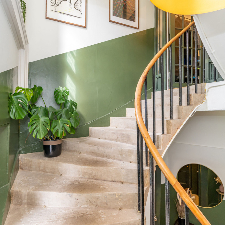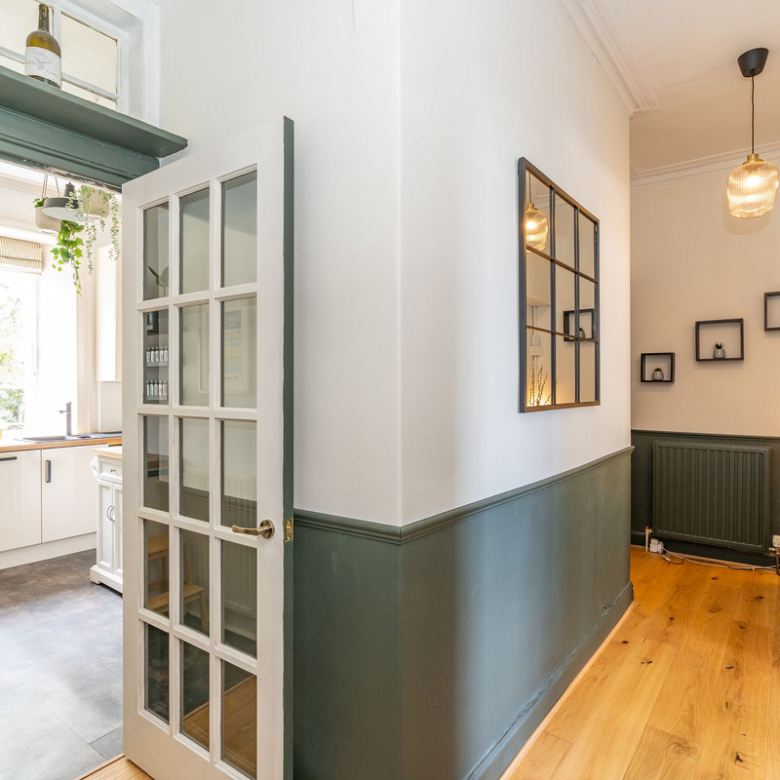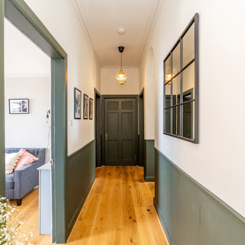 From the picturesque ground floor front porch with white woodwork and climbing wisteria traditional stone stairs with an original balustrade take you to the first floor. Here the sophisticated hallway sets the scene for the rest of the property with its handsome wooden flooring, pendant lighting, six-panel doors, and dado rail finished in a dark green.