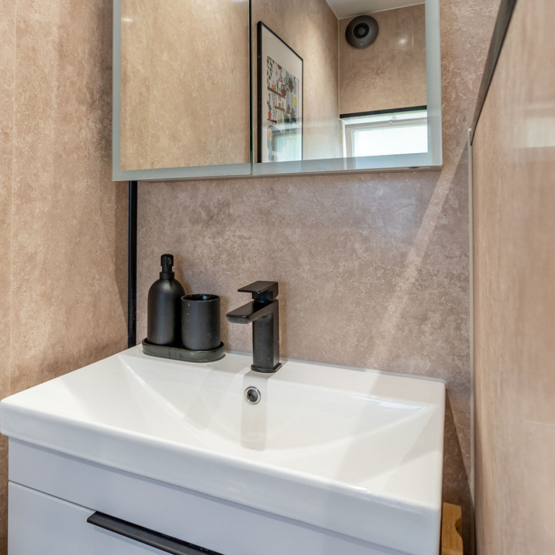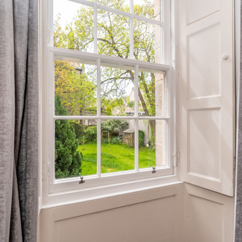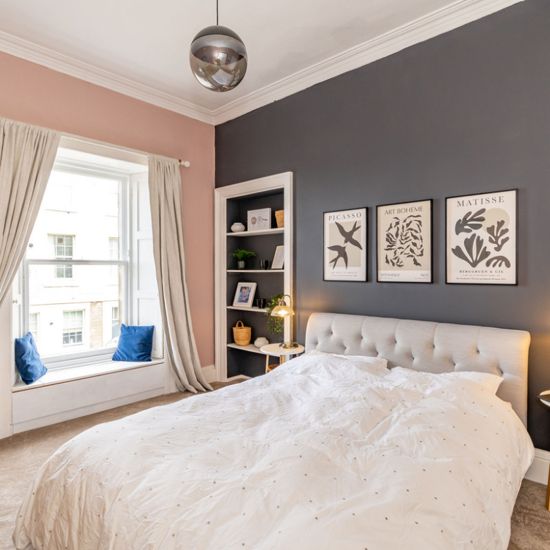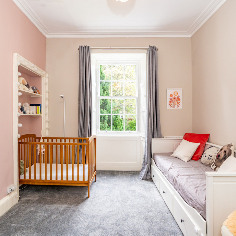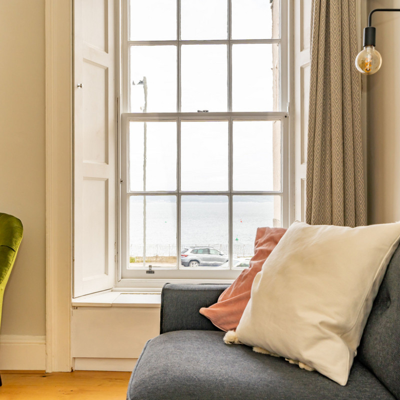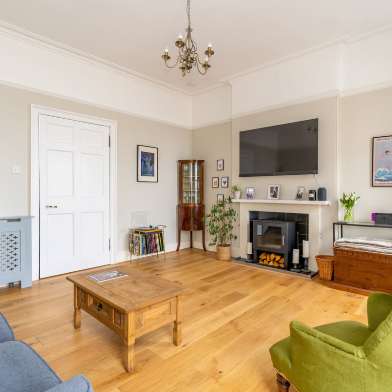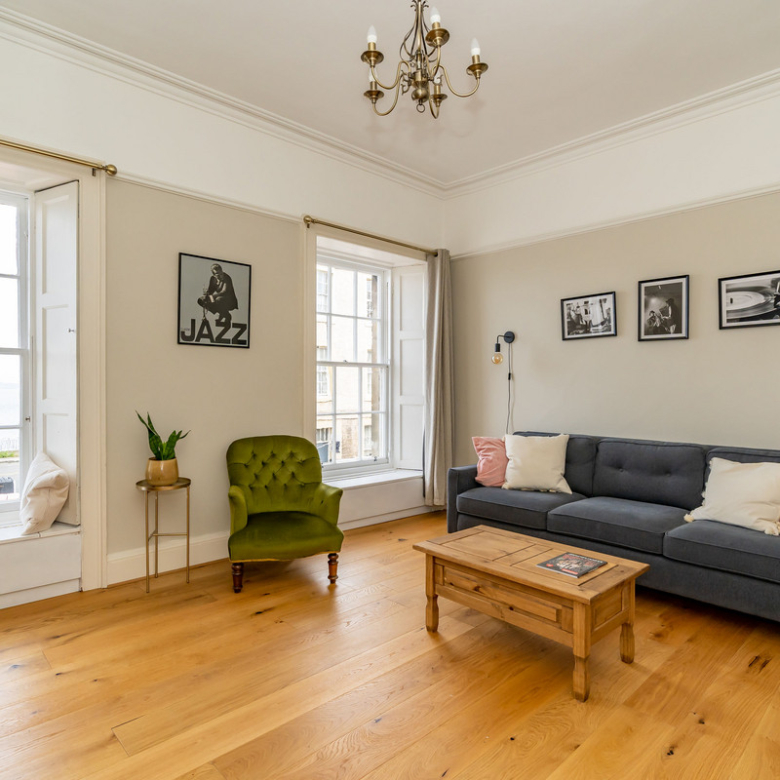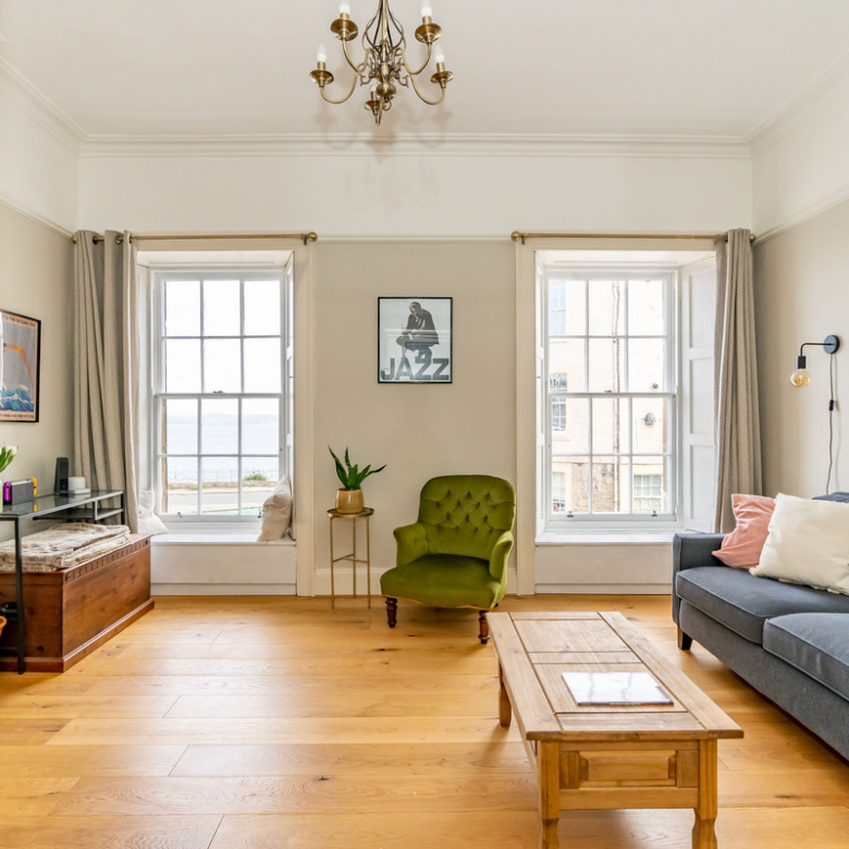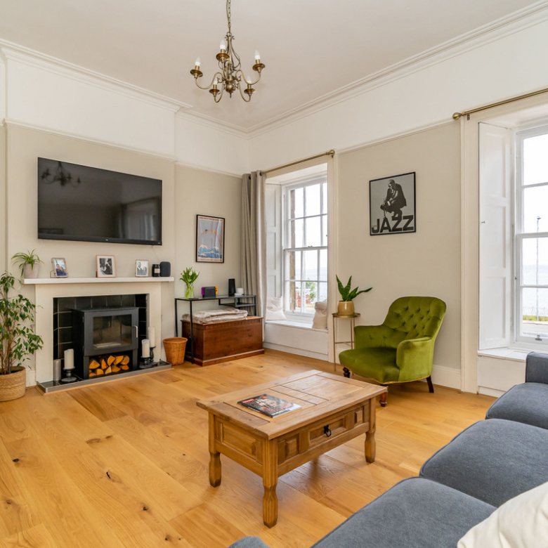 Leaving the hallway, the abundance of natural light and spectacular Firth of Forth views from two original sash and case windows are what strikes you about the exquisite living room. With a light neutral décor, two bespoke window seats, and a bio-ethanol stove set within a white mantlepiece with a black tiled insert this spacious room is the epitome of style and comfort.