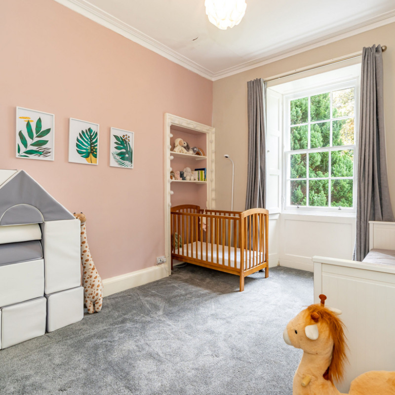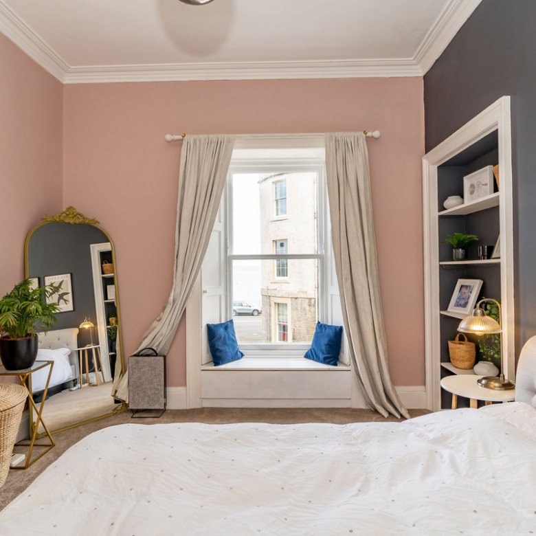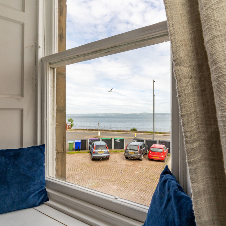Towards the other end of the hall is the principal double bedroom. Boasting a window seat with which to enjoy the wonderful sea view this is a restful and tranquil space. The décor includes plush carpeting, a shelved Edinburgh press, and walk-in wardrobe.