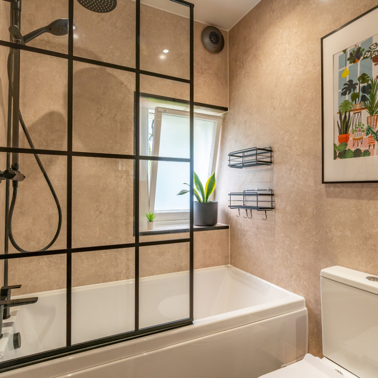 The design-led contemporary bathroom finished in an on-trend black and white set against a warm stone-coloured backdrop features a WC, washbasin built to vanity, towel radiator, and rainfall shower over bath with a striking framed matte black grid screen.