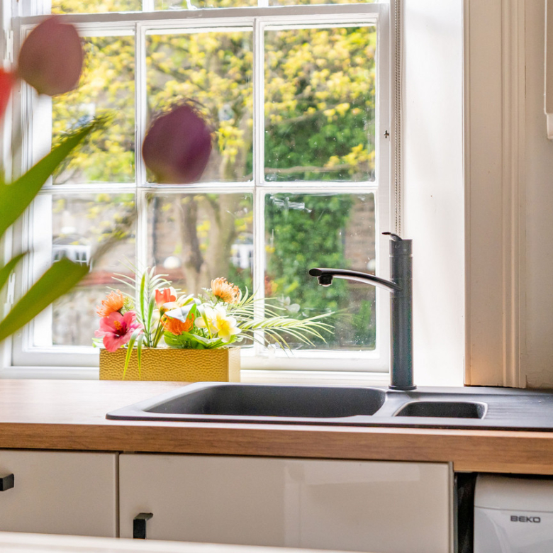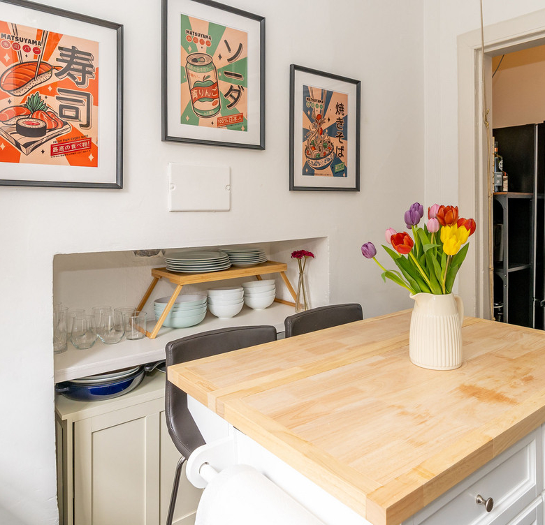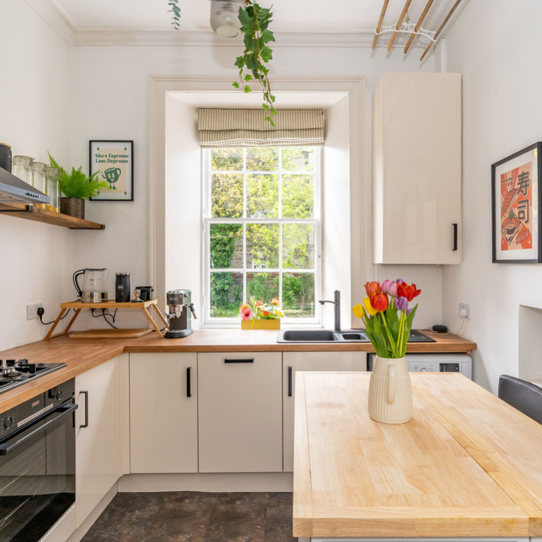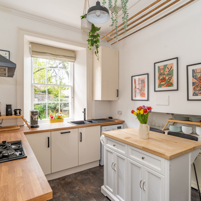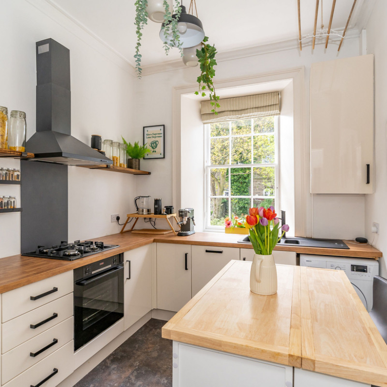 Opposite the living room, the bright south-facing modern kitchen boasts a pleasant leafy garden outlook along with cream base units with black handleware, butcher block worktops, and high-quality integrated appliances including an extractor hood, BOSCH gas hob, and oven. The space is cleverly optimised thanks to a compact moveable island offering seating for two and additional storage, and an adjoining alcove provides room for freestanding appliances.