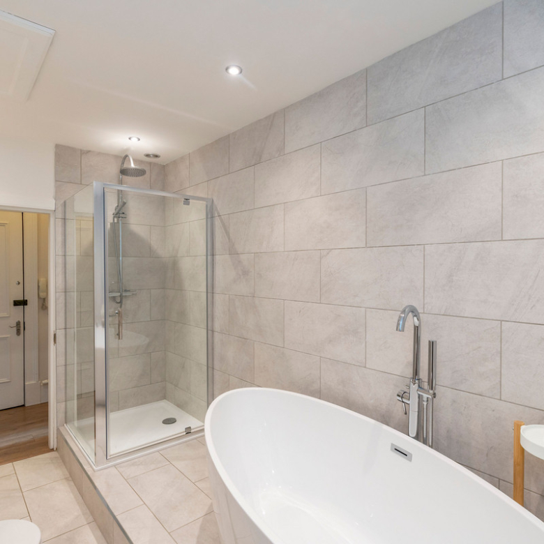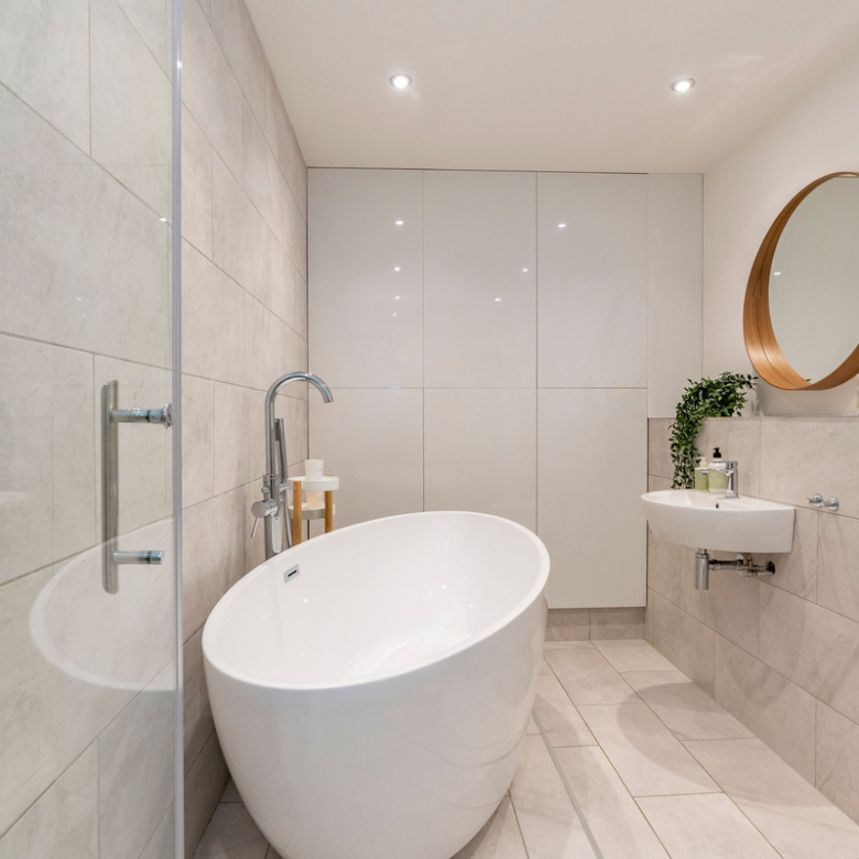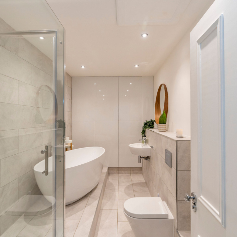 As you return to the hallway, you pass the eye-catching design-led bathroom that comes straight from the pages of an interior magazine. Set against a backdrop of high-quality grey porcelain wall and floor tiles and soft ambient lighting the exquisite white suite is the epitome of timeless luxury. At its centre is a freestanding deep oval bath elevated on a raised floor, which together with a hidden cistern WC, washbasin, rainfall shower enclosure, and chrome towel radiator, create a tranquil sanctuary. There is also a storage utility wall with the washer dryer.