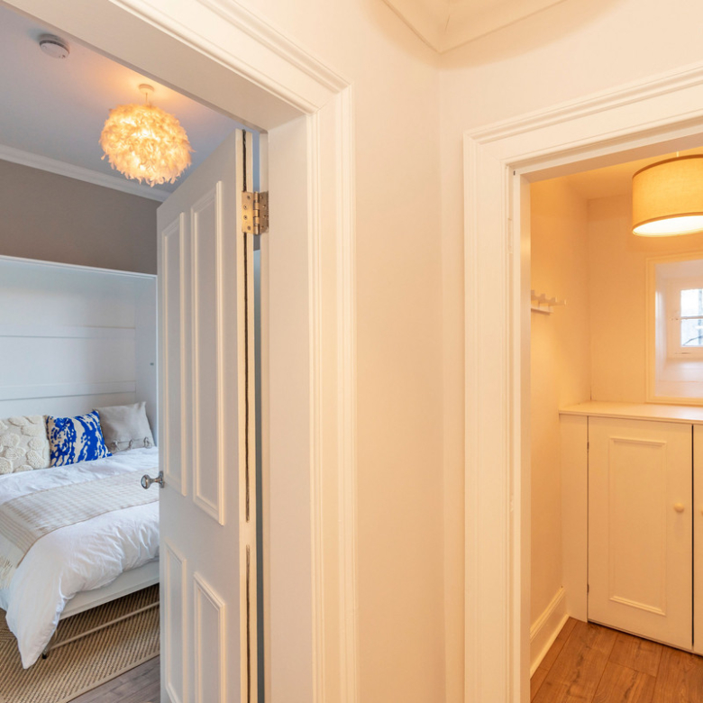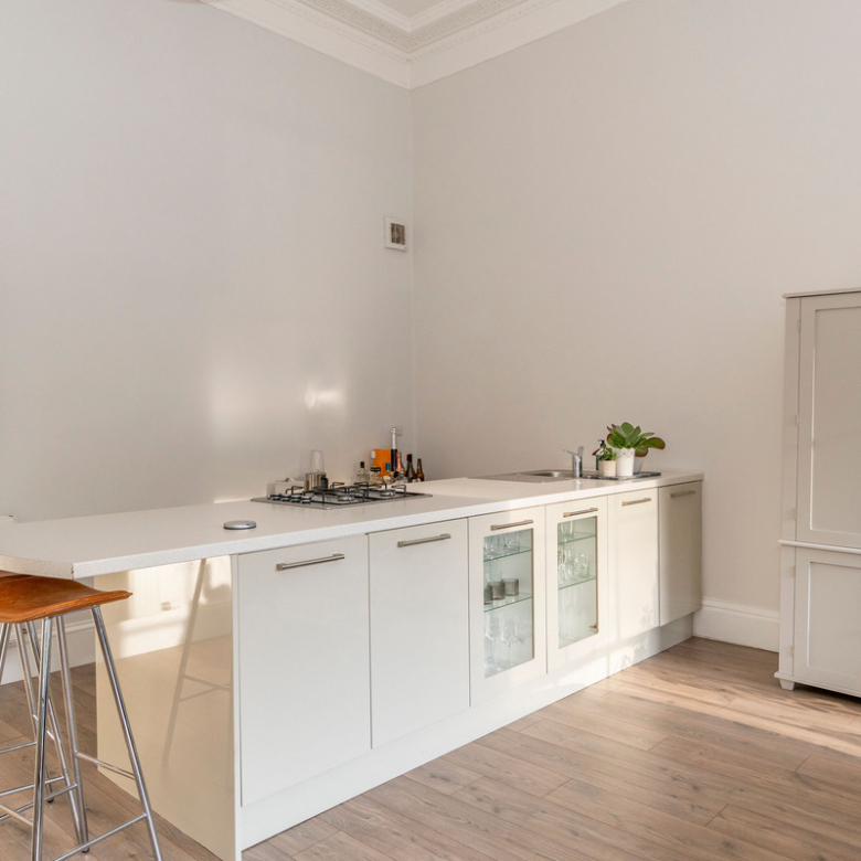 Two stunning double bedrooms lie to the rear of the home, flanking a good-sized cupboard that serves as a versatile space and can be utilised as a compact home office or useful cloakroom. Each boasts a soothing ambience enhanced by a calm colour palette and rich wooden flooring. Lofty ceilings and natural light flooding in from the sash and case windows add to the appeal, as does the spacious footprint. One benefits from chic built-in mirrored wardrobes.