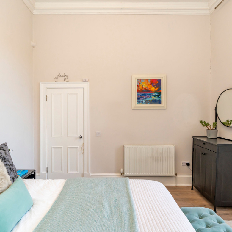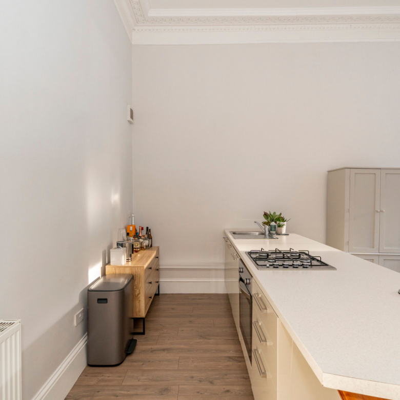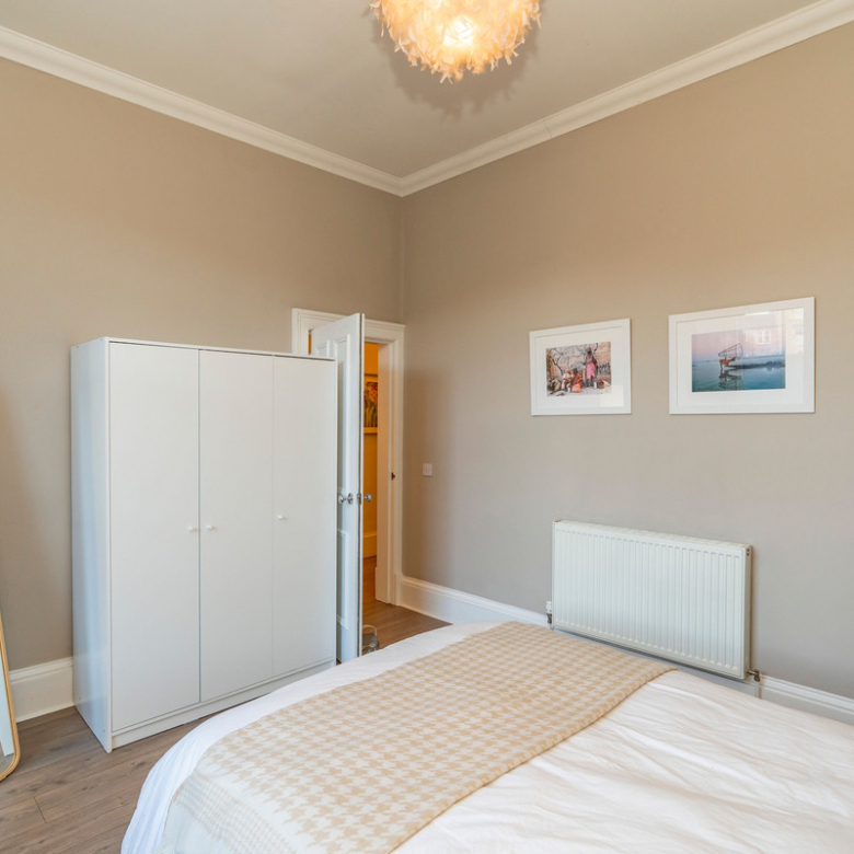 Overlooking Hillside Crescent Gardens, this exceptional living and entertaining area with grand high ceilings is bathed in natural light from sash and case windows complete with working shutters. Boasting a timeless elegance, the décor includes wooden flooring, an original ceiling rose, intricate cornicing, and a built-in Edinburgh press.