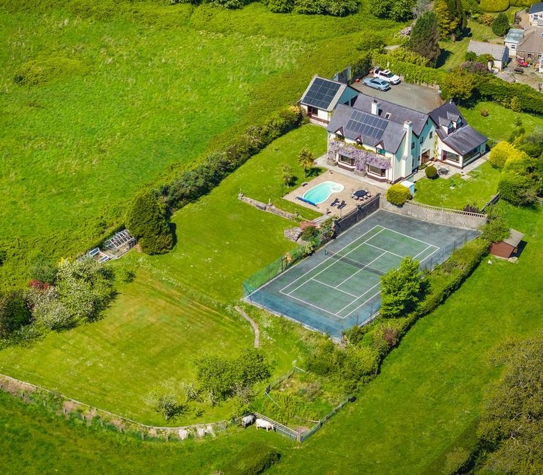 Externally, the property is accessed via a sweeping tarmac driveway leading to a large parking area and the detached double garage. A gate along the driveway provides access to approximately 1.18 acres of pasture and woodland located to the side of the property. Surrounding the house, facing due south, you’ll find beautifully maintained gardens, which include two greenhouses and two large cold frames, an outdoor heated swimming pool, stables, and a tennis court. The swimming pool is heated by panels on the rear of the detached garage, with an additional 4 kW of panels on the roof of the house.