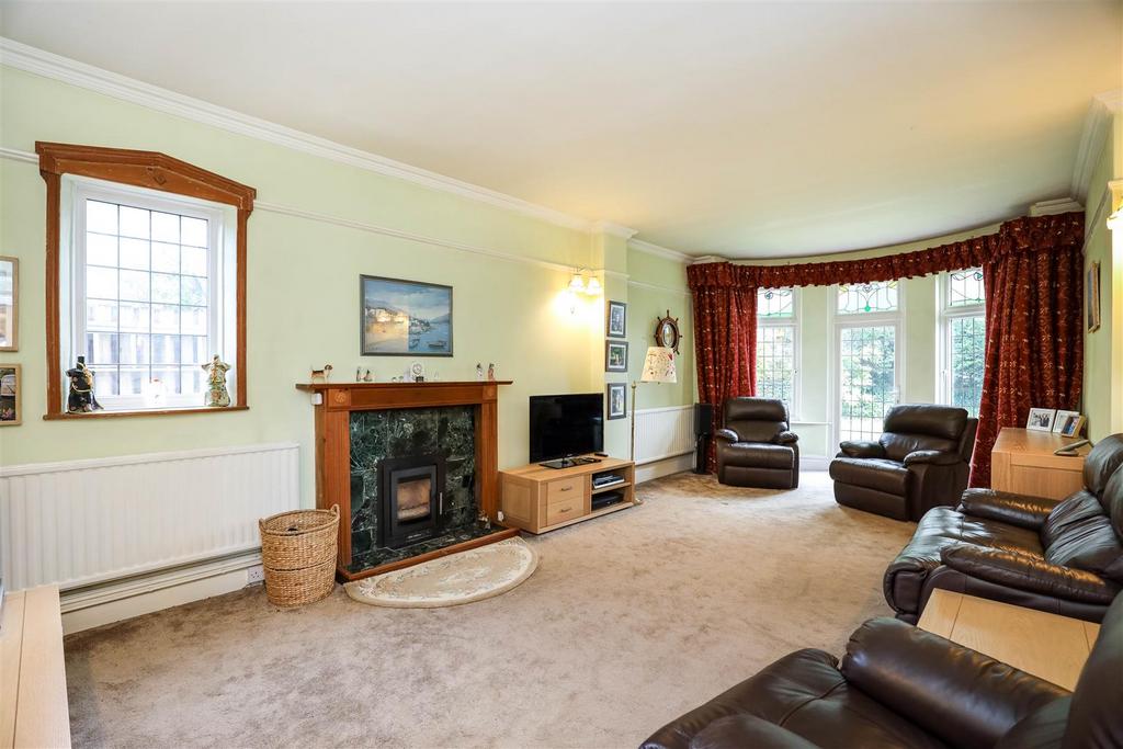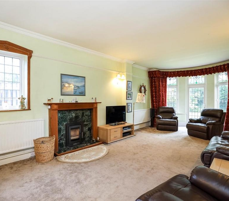 The spacious bay-fronted sitting room enjoys carpeted flooring, a central feature recessed log burning stove with a traditional wooden surround, a uPVC double glazed window to the side elevation and a uPVC bay window with period stained glass windows to the front elevation.
