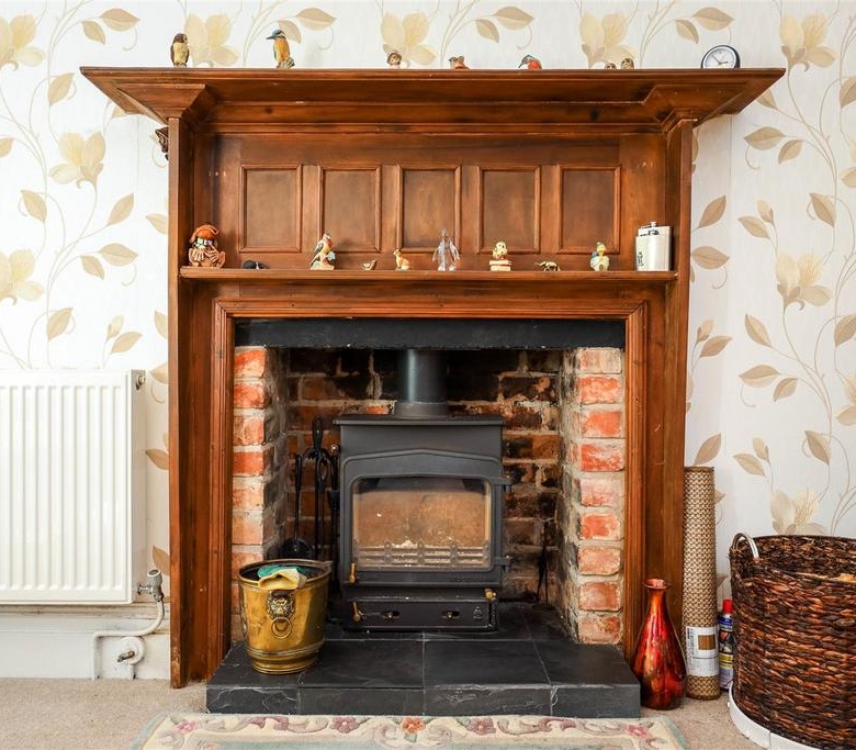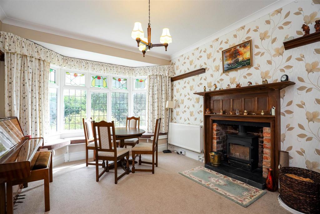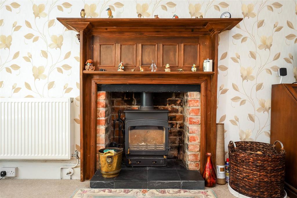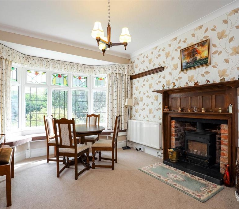 The bay-fronted dining room offers continuation of carpeted flooring, a central log burner with wooden traditional surround and a uPVC double glazed window with period stained glass to the front elevation.