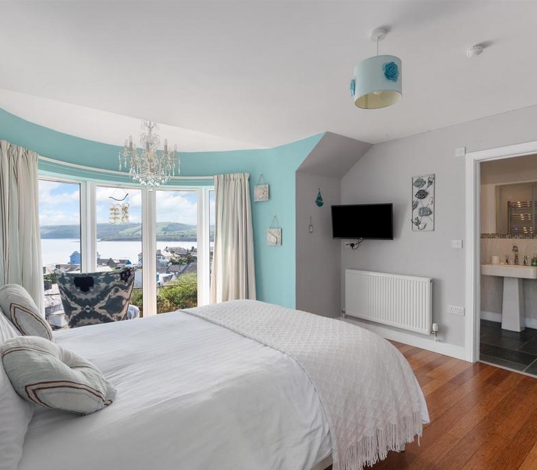 On the third floor the remaining bedrooms are found, finished to a exacting standard as the others, however at this elevated position, the views are even more incredible. The Master bedroom features a large curved window bay to the front, perfectly framing the views of Cardigan Bay and allowing you to peer down on the busy village below. The en-suite bathroom has a Jacuzzi bath whilst the other double bedroom at this level has a similar feature curved shower room with mosaic tiled wall.