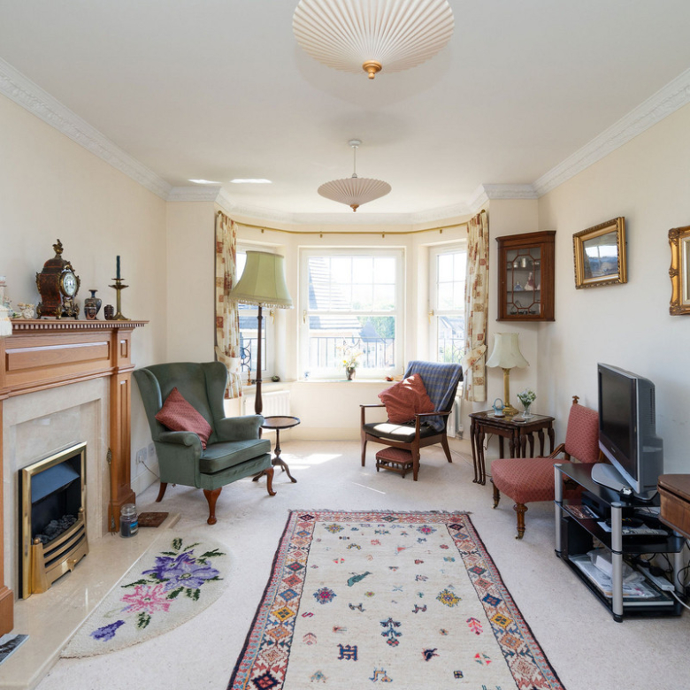 Inside, a welcoming carpeted hallway with built-in storage leads to a generous south-facing living room. Bathed in natural light from a bay window, this elegant space features a neutral décor, plush carpeting, and a living flame fireplace, creating a warm and relaxing atmosphere.