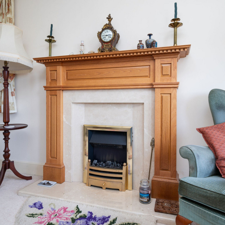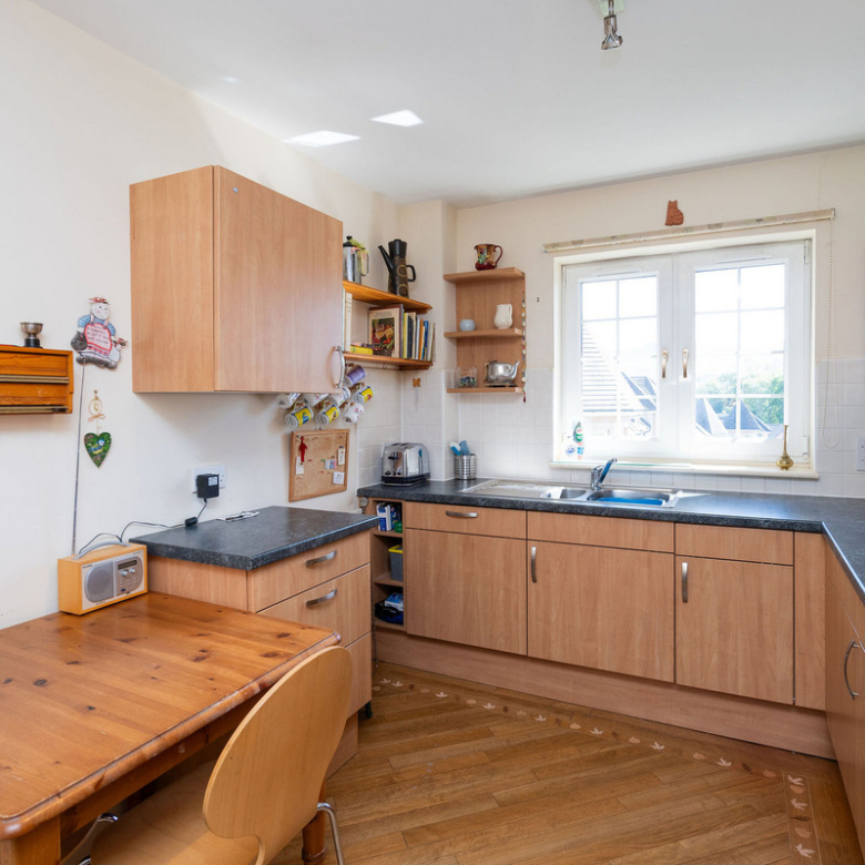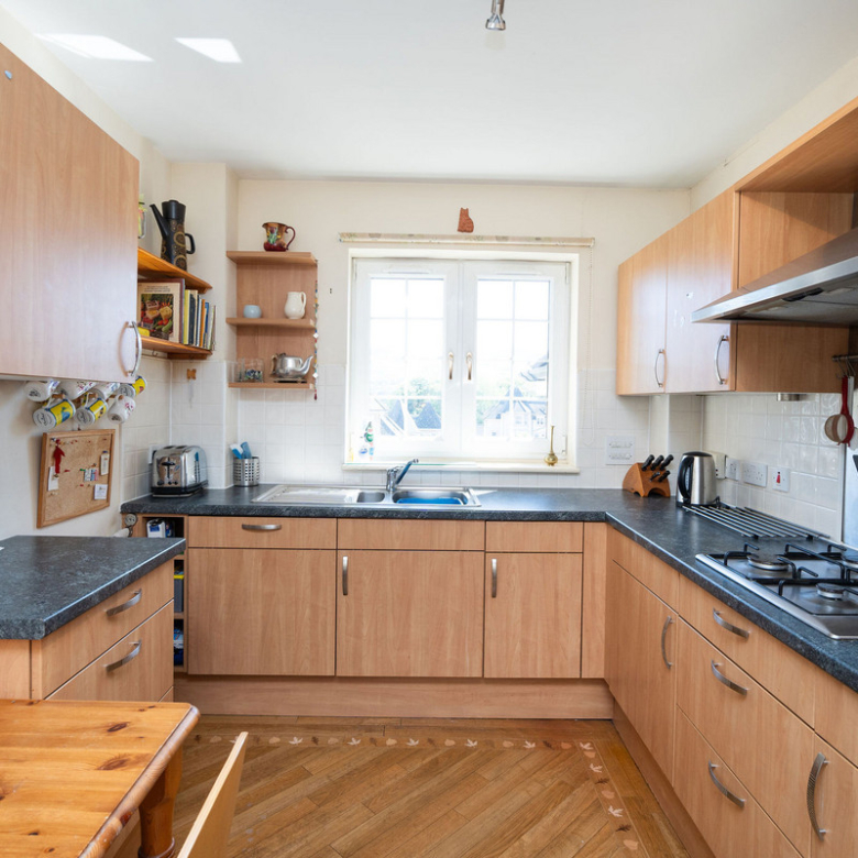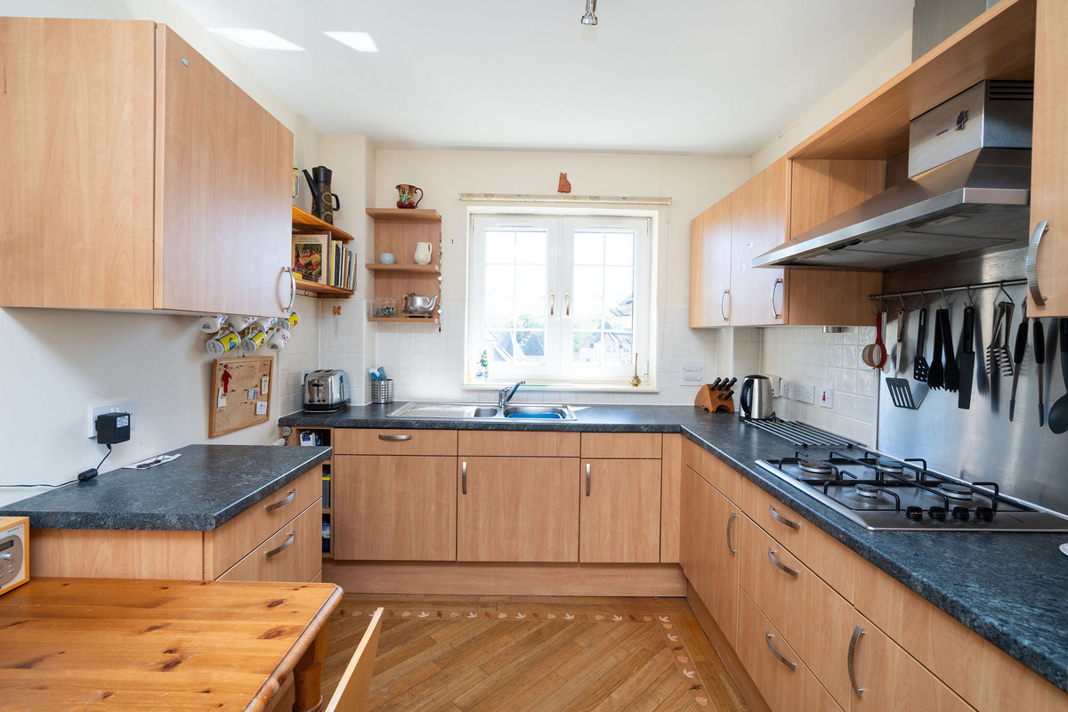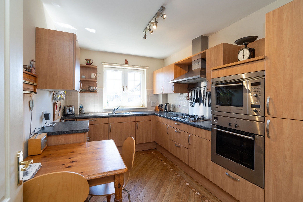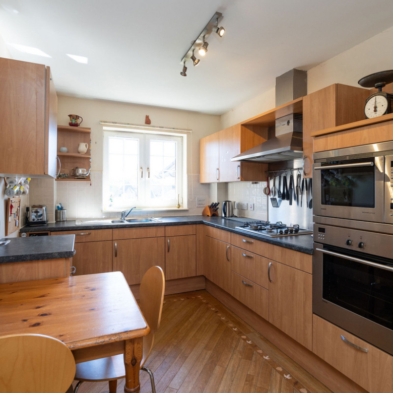 The adjacent modern kitchen also enjoys a sunny south-facing aspect and allows for informal dining. Finished with wood-effect cabinetry and black quartz-effect worktops, it comes fully equipped with high-spec integrated appliances including a gas hob, eye-level microwave, oven, and extractor hood.
